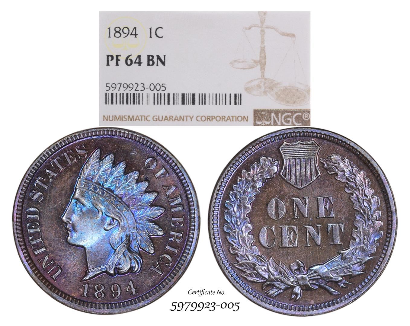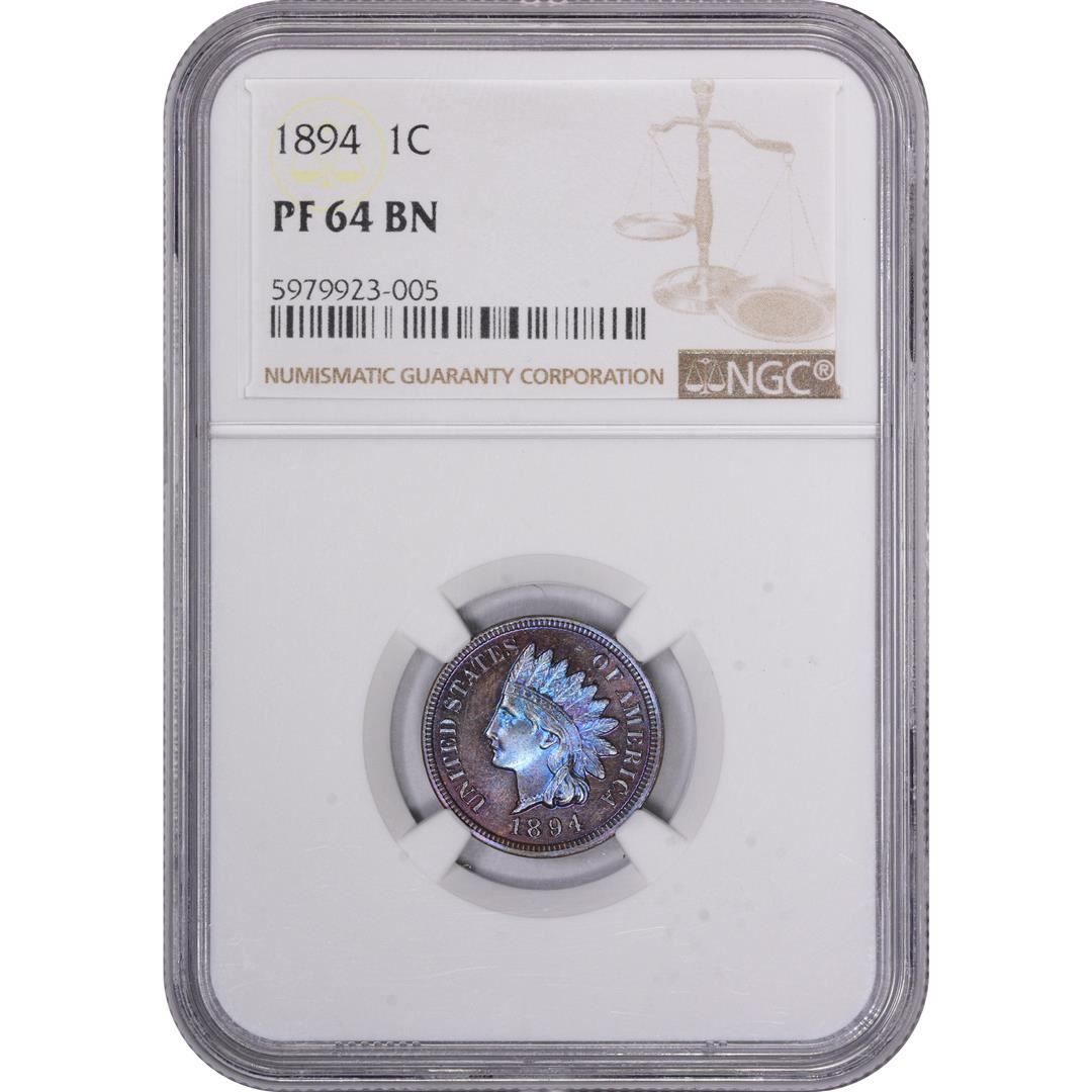 One 1894 Proof Indian Head Cent Coin NGC PF64 BN Amazing Toning. NGC Certified.