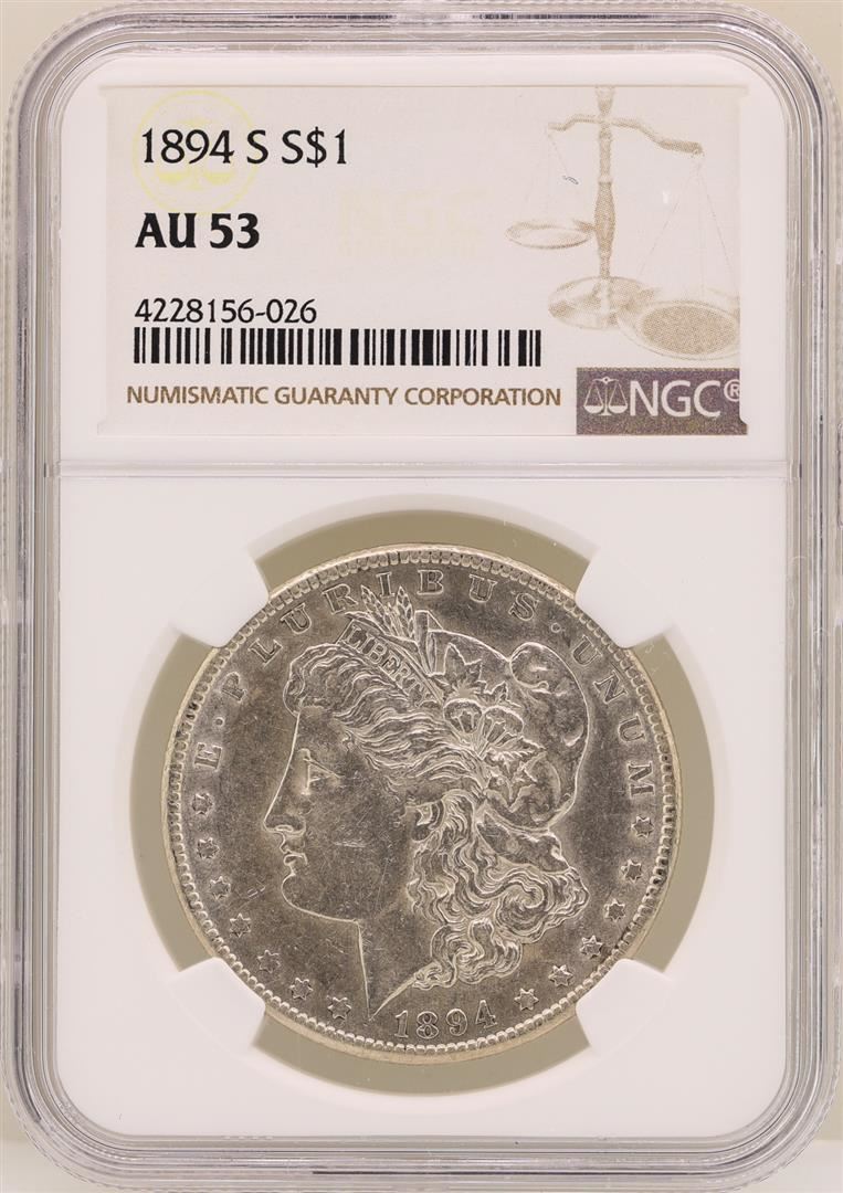 One 1894-S $1 Morgan Silver Dollar Coin NGC AU53. NGC Certified.