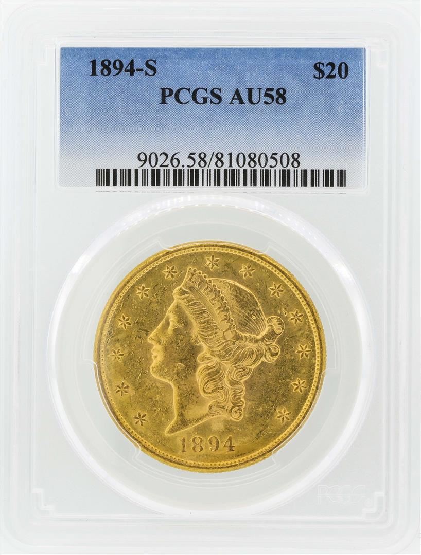 One 1894-S $20 Liberty Head Double Eagle Gold Coin PCGS AU58. PCGS Graded.
