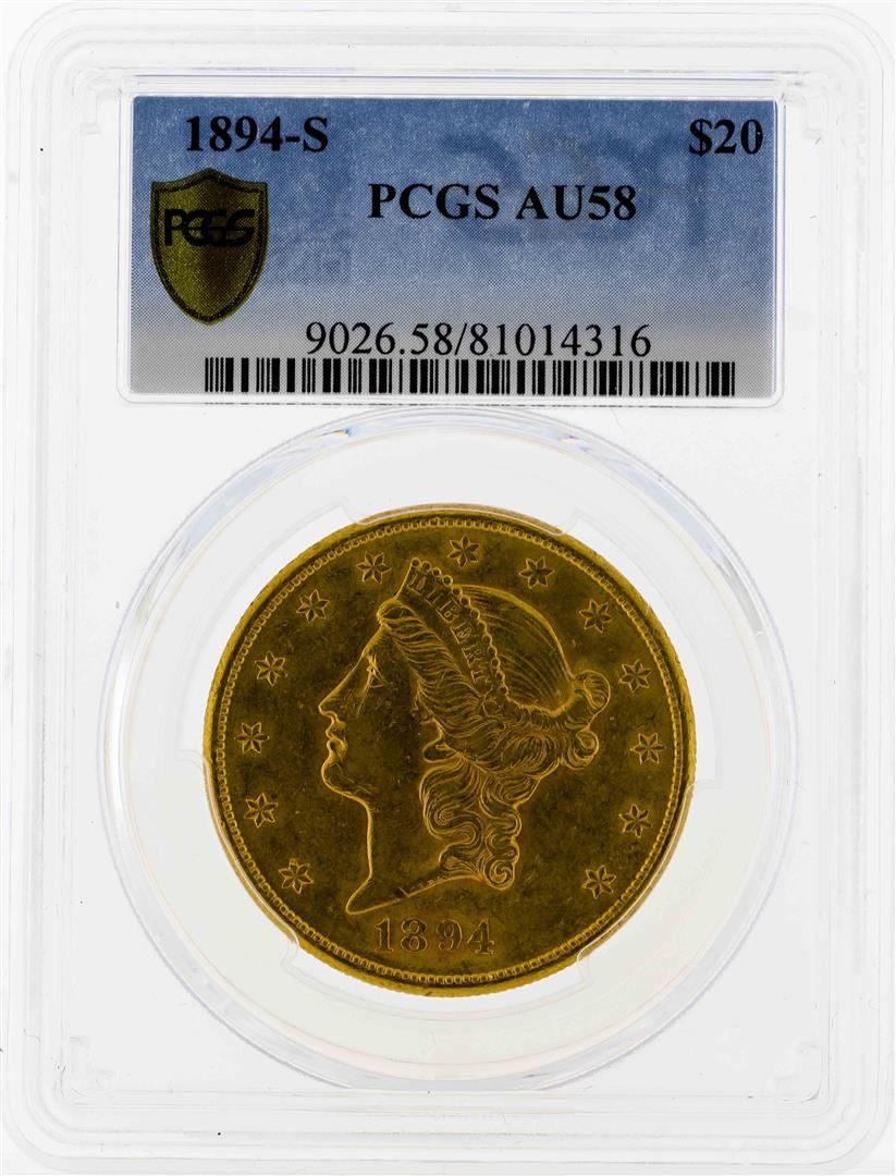 One 1894-S $20 Liberty Head Double Eagle Gold Coin PCGS AU58. PCGS Graded.