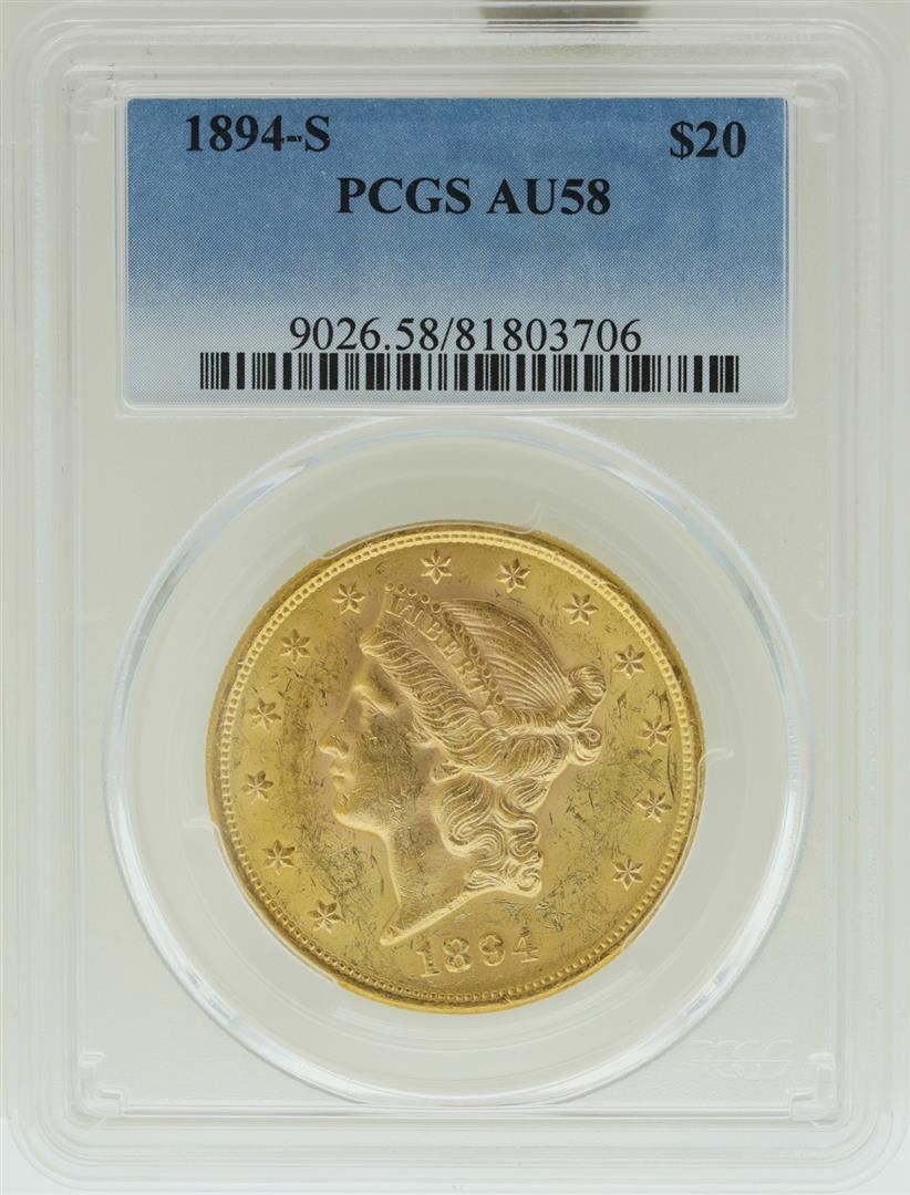 One 1894-S $20 Liberty Head Double Eagle Gold Coin PCGS AU58. PCGS Graded.