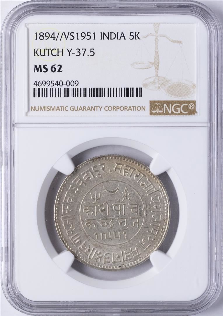One 1894//VS1951 India 5 Kori Silver Coin NGC MS62. NGC Certified.