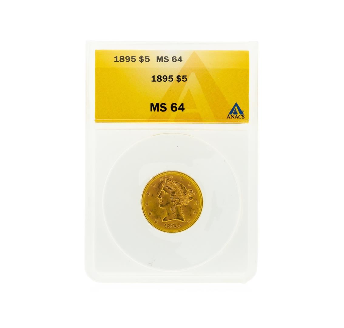 One 1895 $5 Liberty Head Half Eagle Gold Coin ANACS Graded MS64. ANACS Certified.