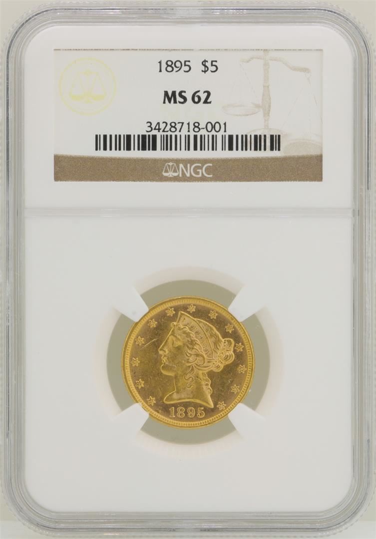 One 1895 $5 Liberty Head Half Eagle Gold Coin NGC MS62. NGC Certified.