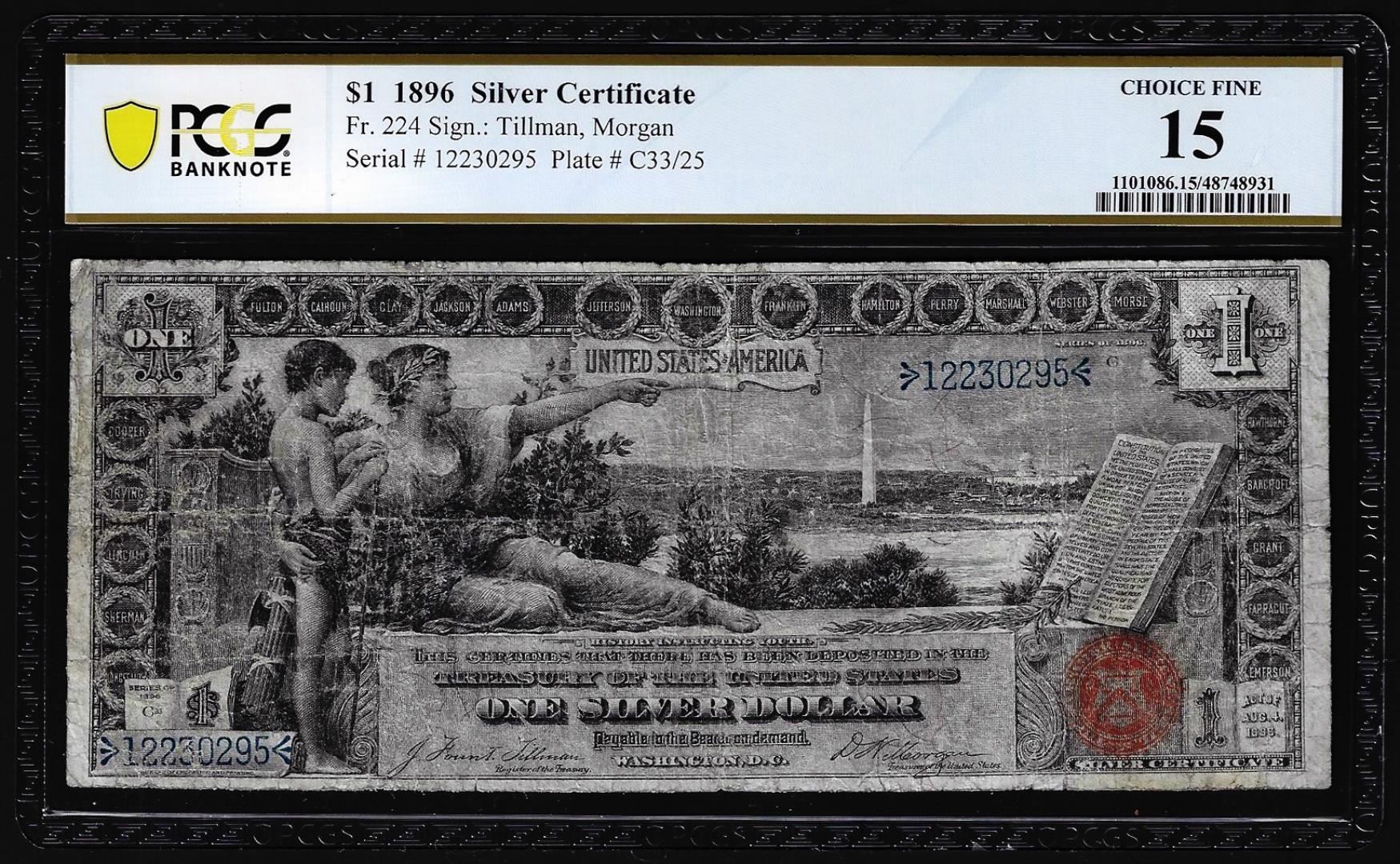 One 1896 $1 Educational Silver Certificate Note Fr.224 PCGS Choice Fine 15. PCGS Graded.
