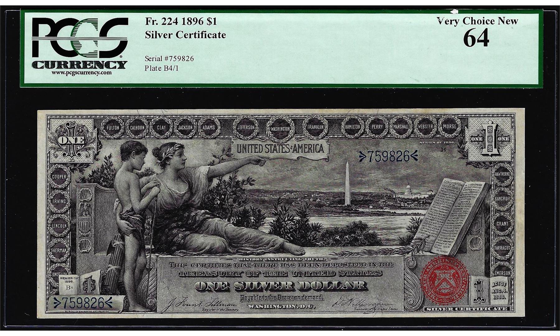 One 1896 $1 Educational Silver Certificate Note Fr.224 PCGS Very Choice New 64. PCGS Graded.