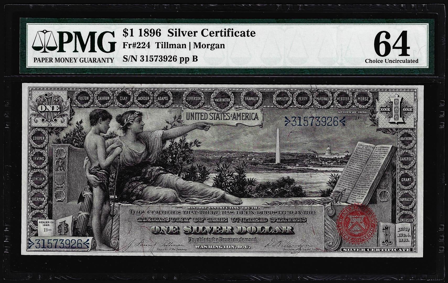 One 1896 $1 Educational Silver Certificate Note Fr. 224 PMG Choice Uncirculated 64. PMG Certified.