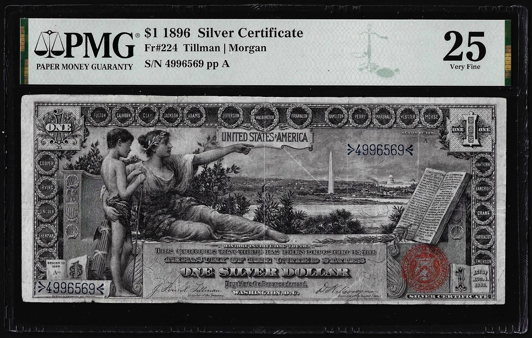 One 1896 $1 Educational Silver Certificate Note Fr.224 PMG Very Fine 25. PMG Certified.