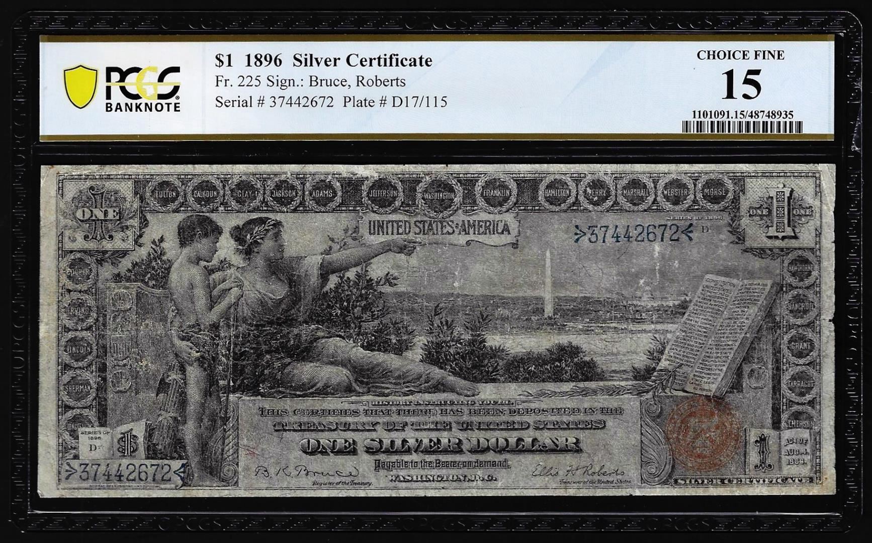 One 1896 $1 Educational Silver Certificate Note Fr.225 PCGS Choice Fine 15. PCGS Graded.