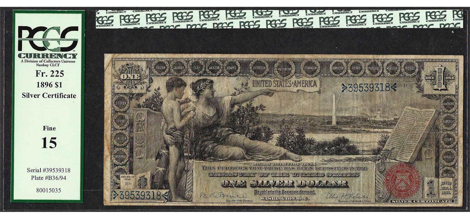One 1896 $1 Educational Silver Certificate Note Fr.225 PCGS Fine 15. PCGS Graded.