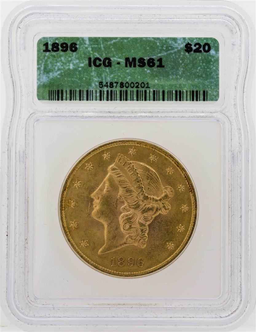 One 1896 $20 Liberty Head Double Eagle Gold Coin ICG MS61. ICG Certified.