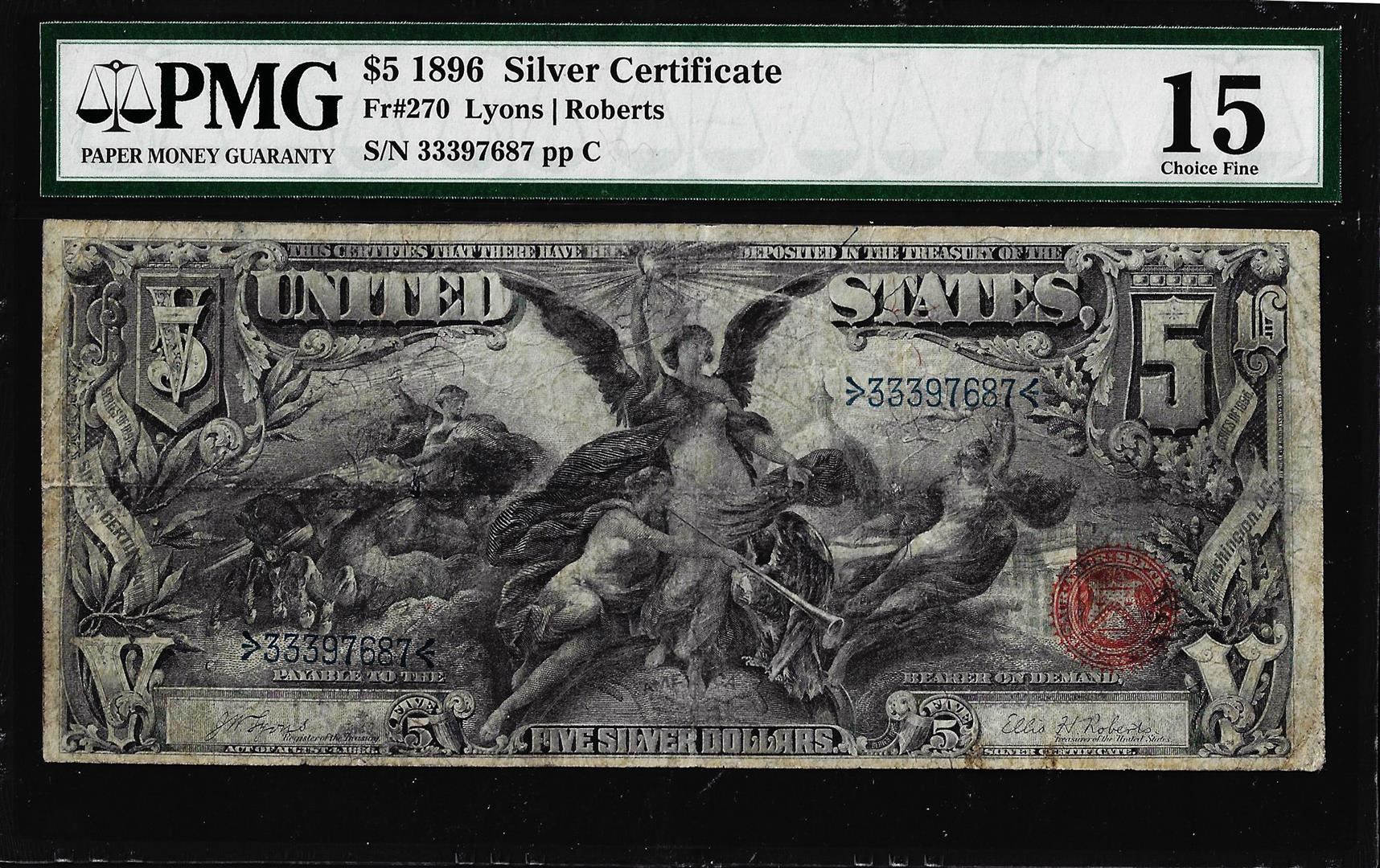One 1896 $5 Educational Silver Certificate Note Fr.270 PMG Choice Fine 15. PMG Certified.
