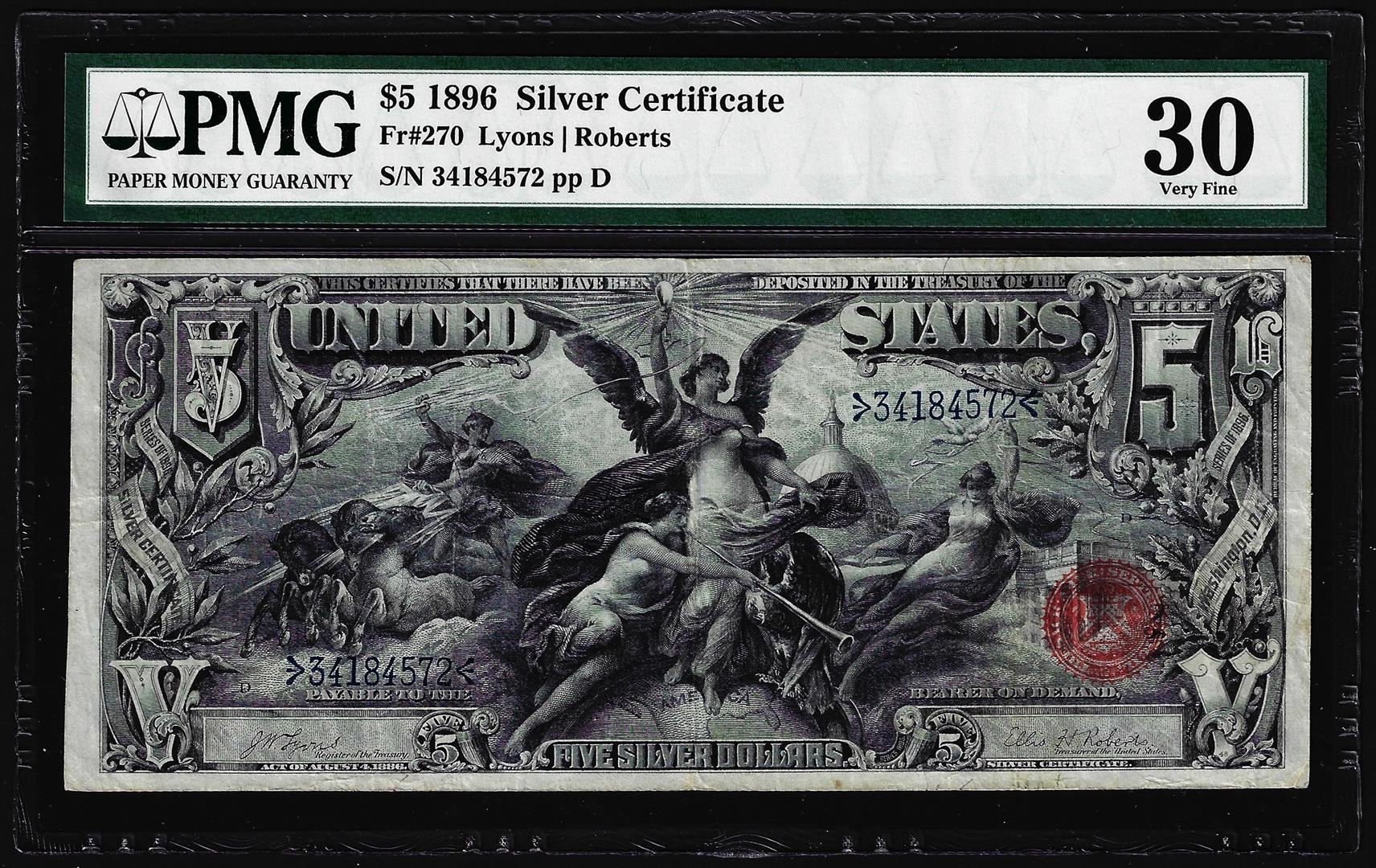 One 1896 $5 Educational Silver Certificate Note Fr.270 PMG Very Fine 30. PMG Certified.