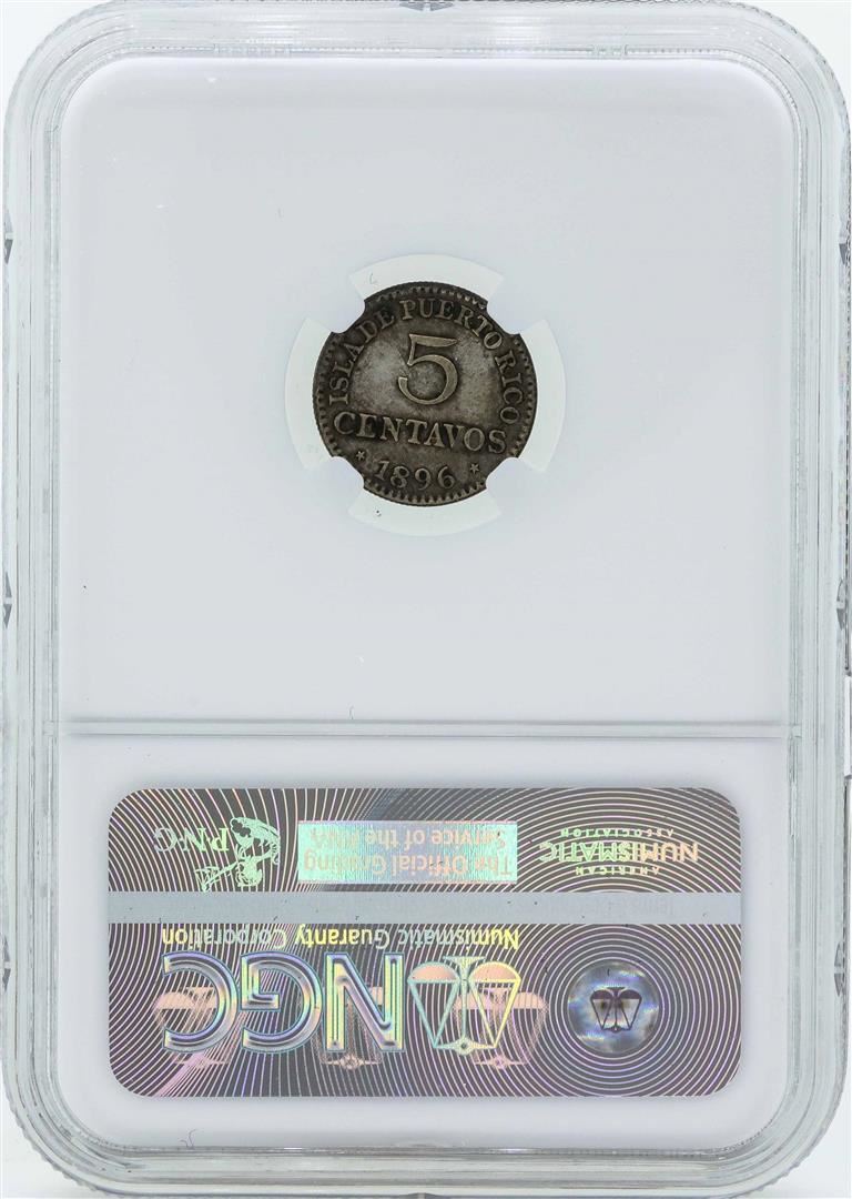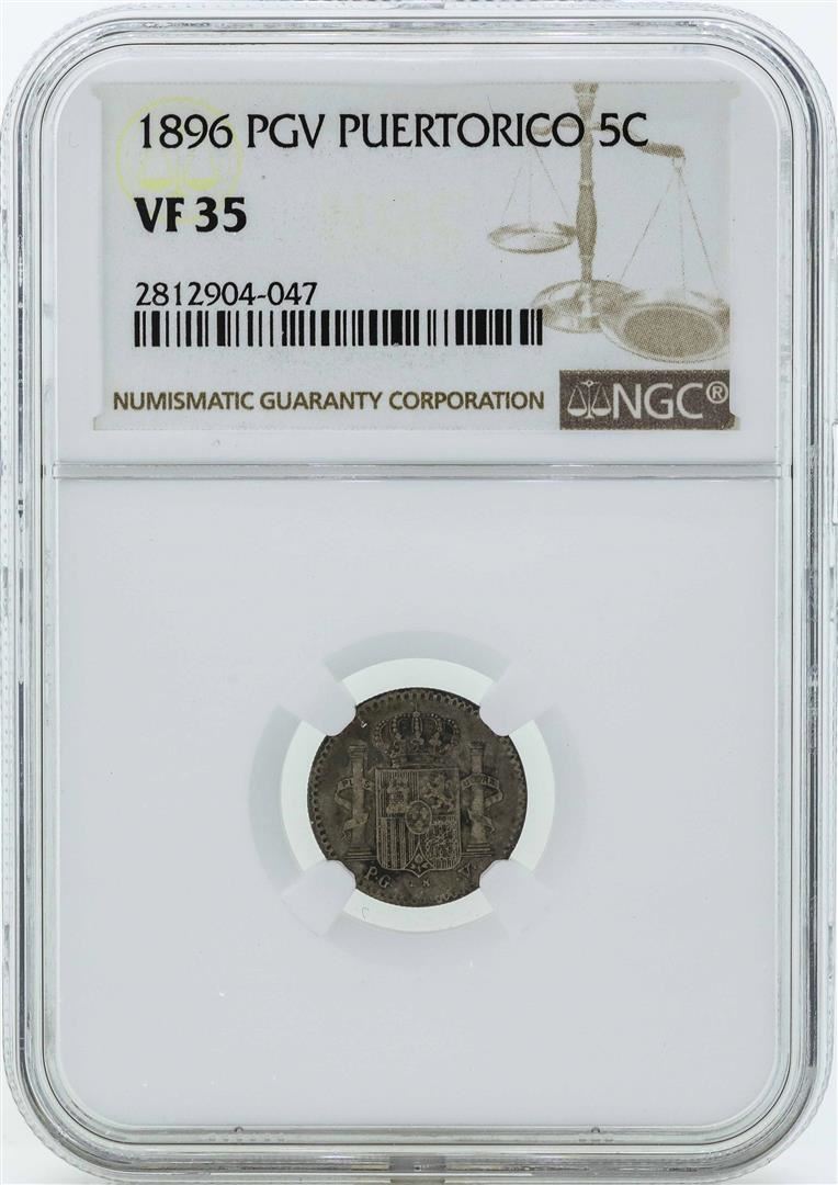 One 1896 PGV Puerto Rico 5 Centavos Coin NGC VF35. NGC Certified.