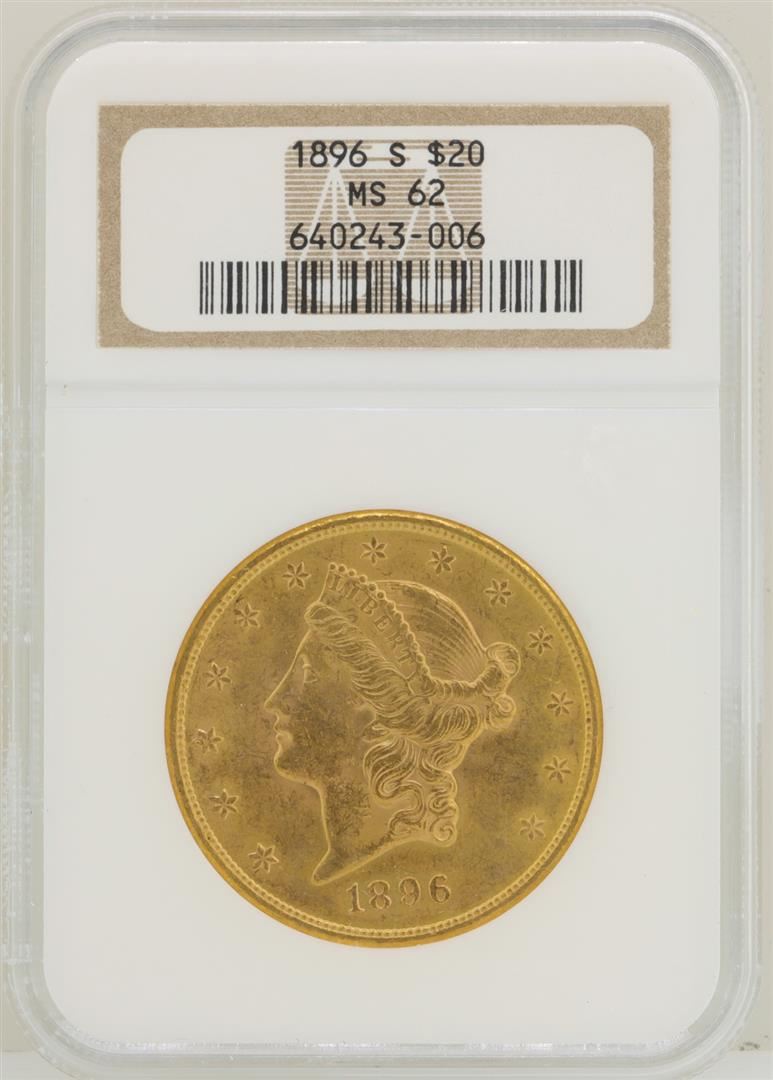 One 1896-S $20 Liberty Head Double Eagle Gold Coin NGC MS62. NGC Certified.