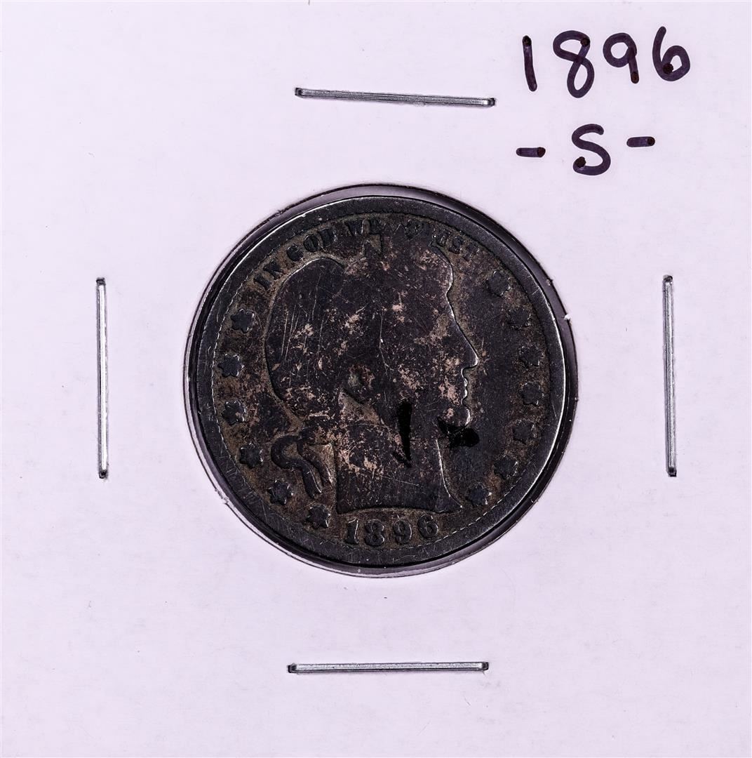 One 1896-S Barber Quarter Coin.