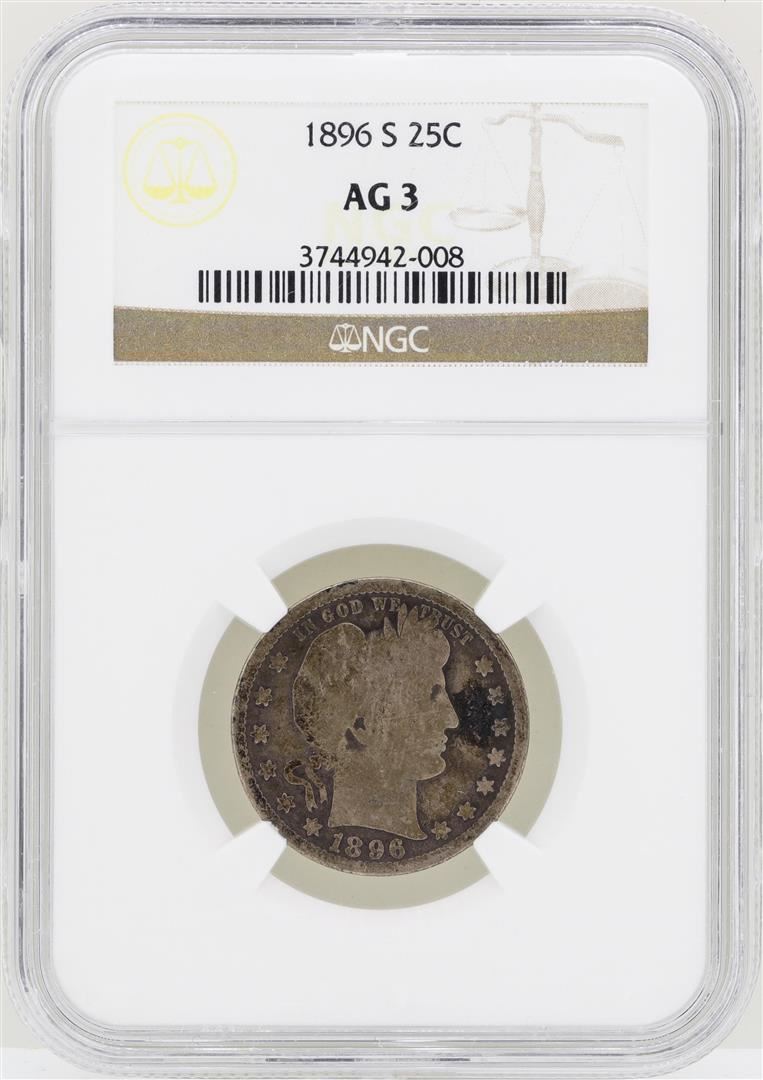 One 1896-S Barber Quarter Silver Coin NGC AG3. NGC Certified.