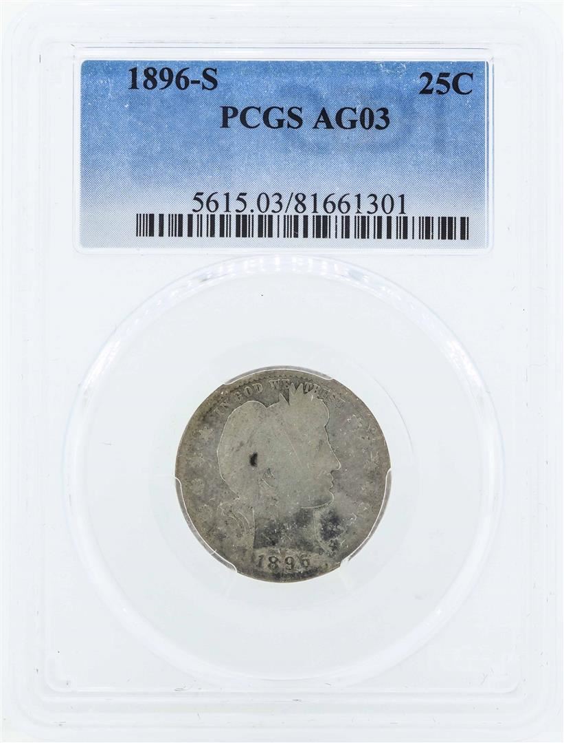 One 1896-S Barber Silver Quarter Coin PCGS AG03. PCGS Graded.