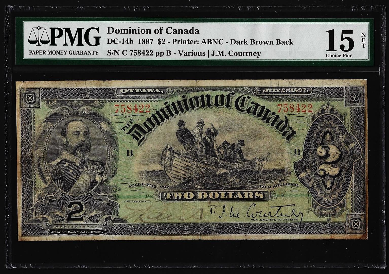 One 1897 $2 Dominion of Canada Note DC-14b PMG Choice Fine 15 Net. PMG Certified.