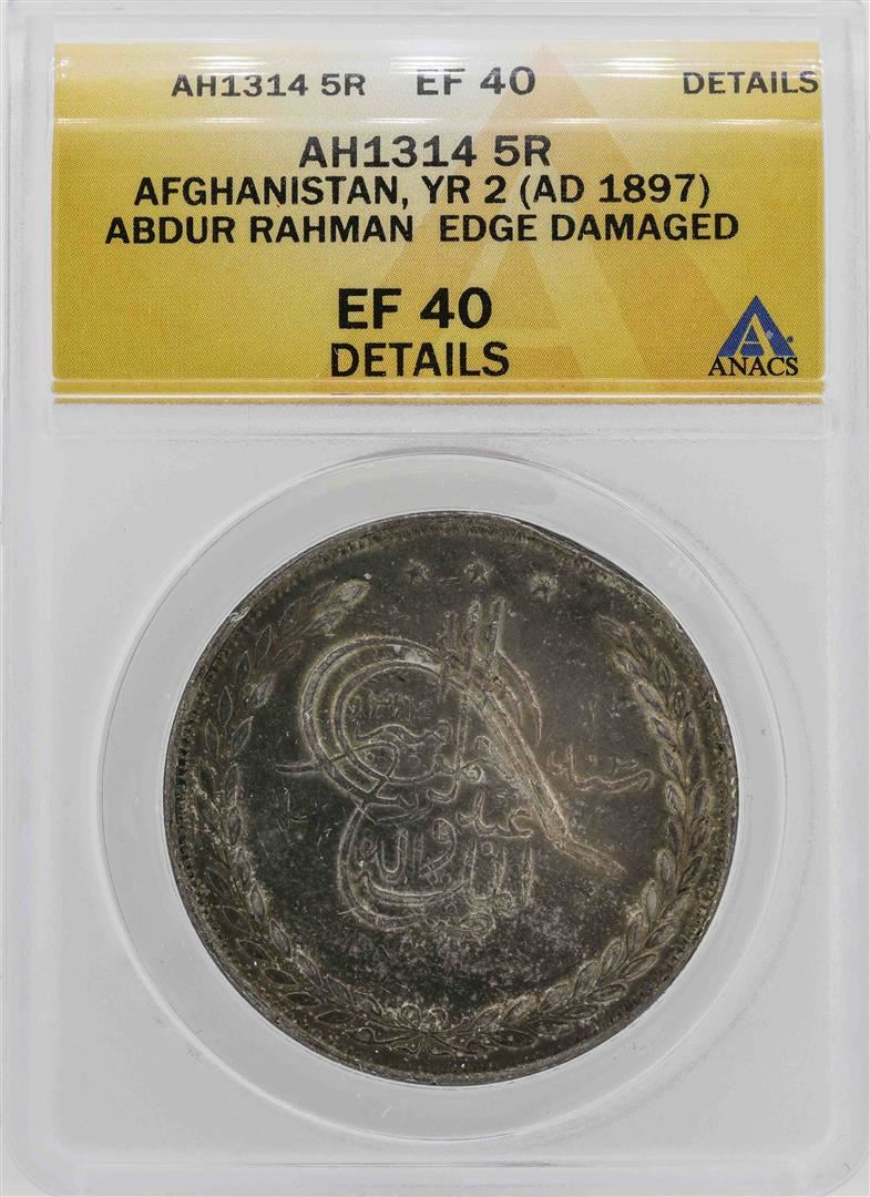 One 1897 Afghanistan Abdur Rahman AH1314 5 Rupees Coin ANACS XF40 Details. ANACS Certified.