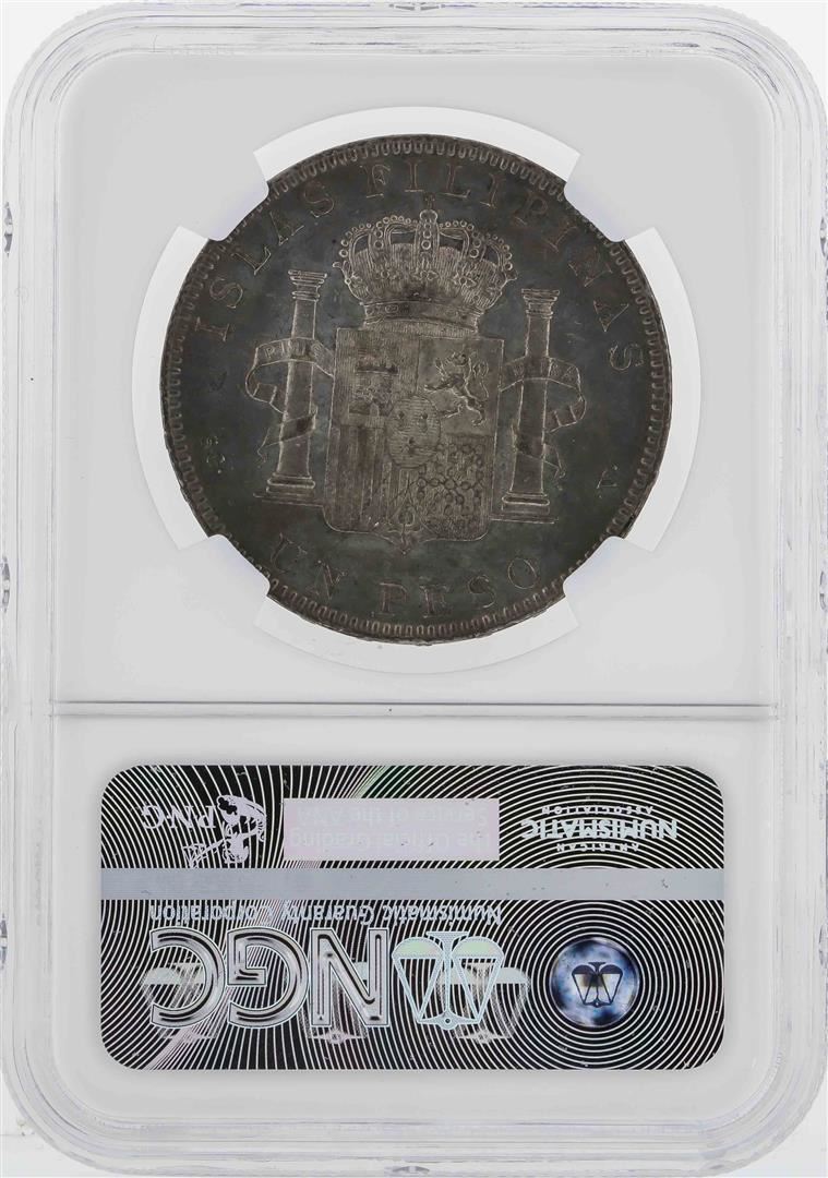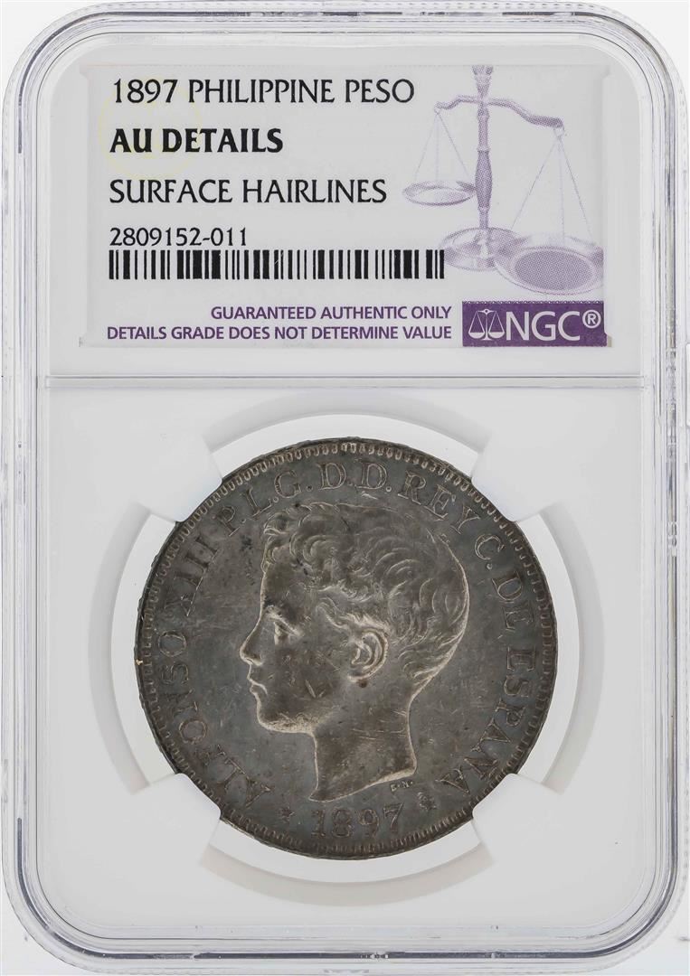 One 1897 Philippine Surface Hairlines Peso NGC AU Details. NGC Certified.