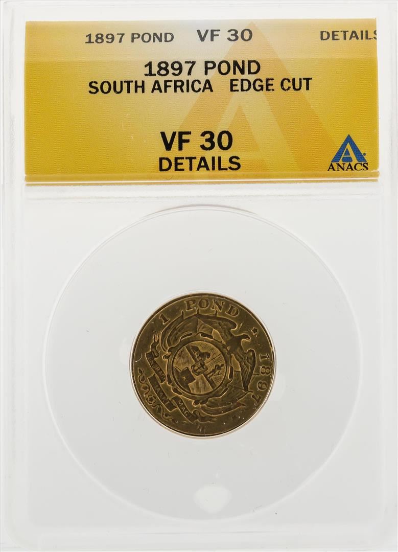 One 1897 Pond South Africa Edge Cut Gold Coin ANACS VF30 Details. ANACS Certified.