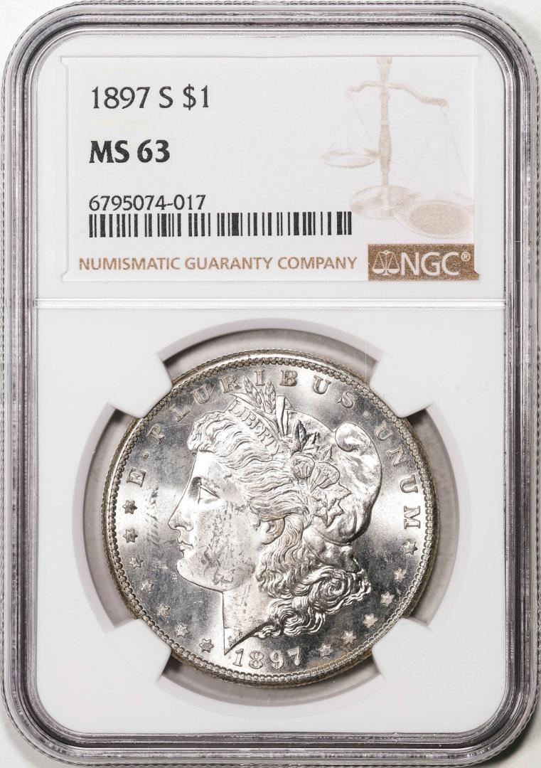 One 1897-S $1 Morgan Silver Dollar Coin NGC MS63. NGC Certified.