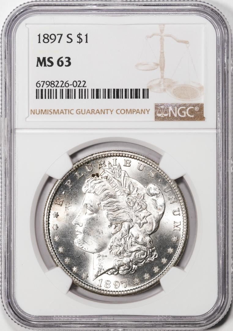 One 1897-S $1 Morgan Silver Dollar Coin NGC MS63. NGC Certified.
