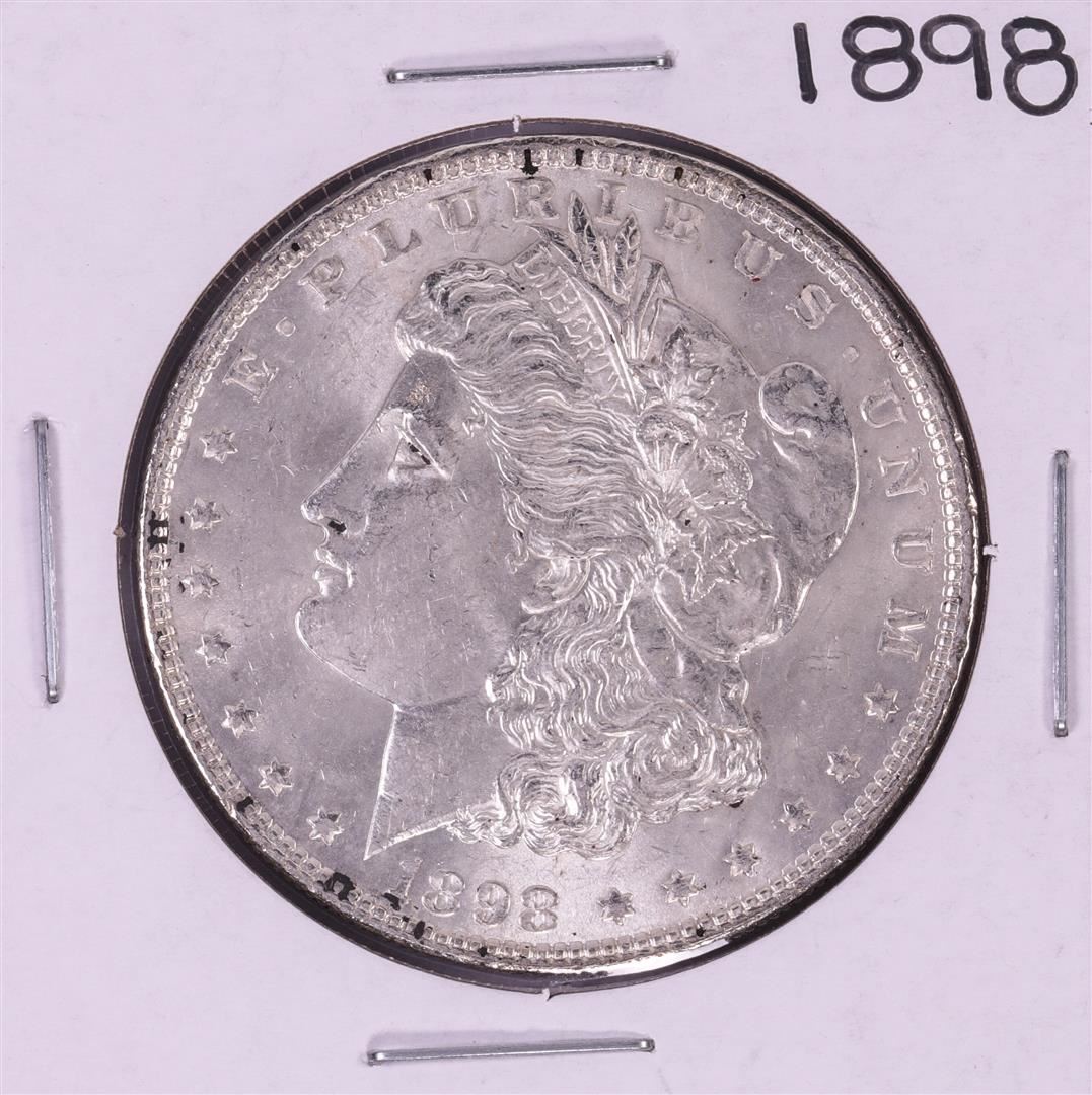 One 1898 $1 Morgan Silver Dollar Coin.