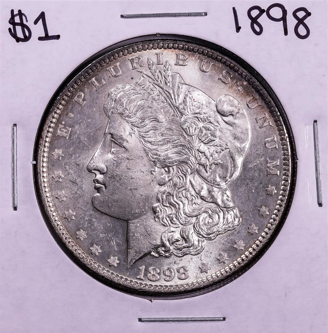 One 1898 $1 Morgan Silver Dollar Coin.