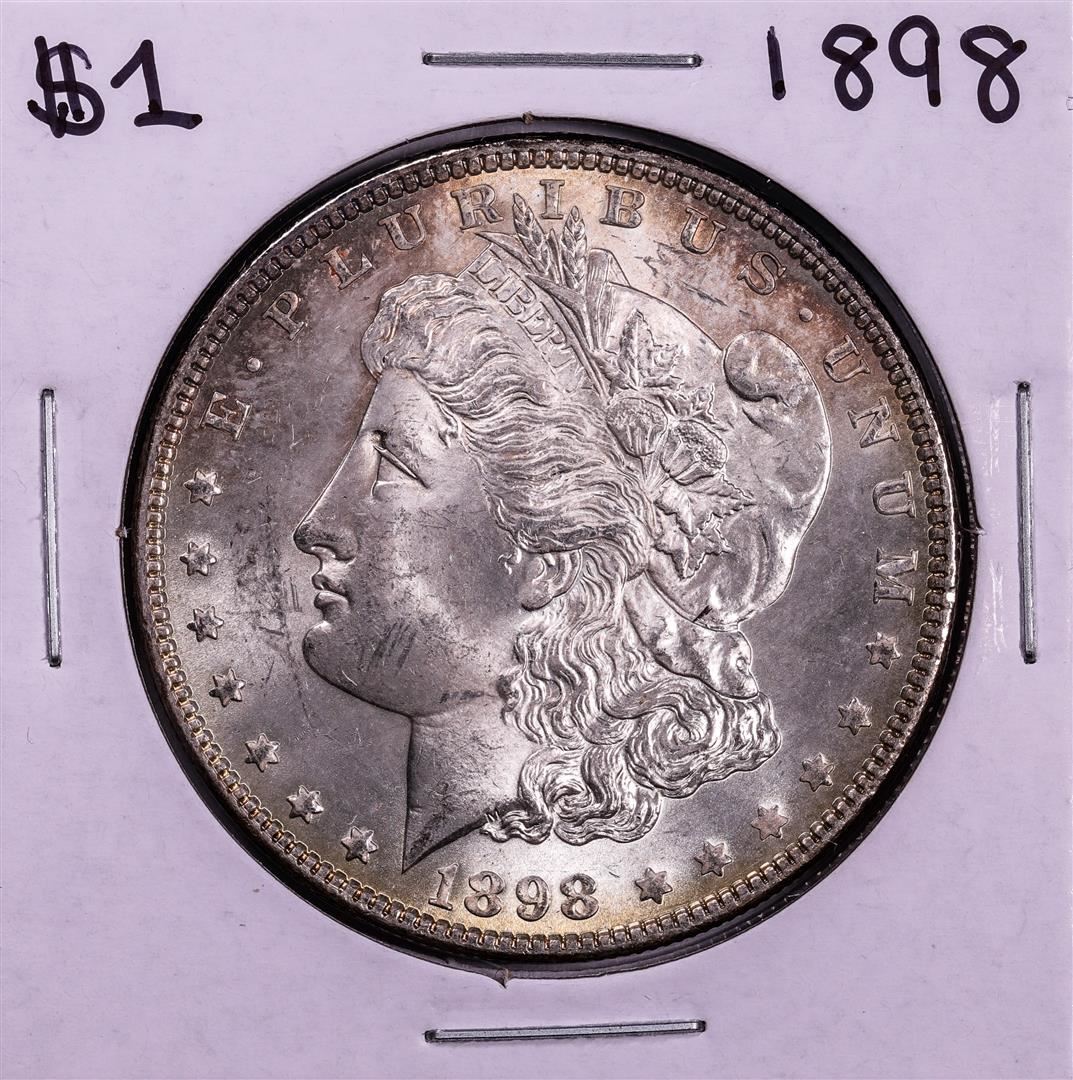 One 1898 $1 Morgan Silver Dollar Coin.