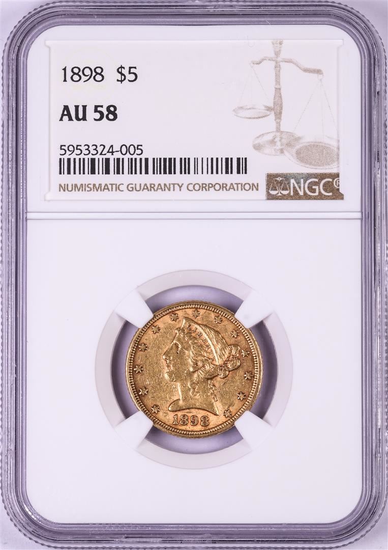 One 1898 $5 Liberty Head Half Eagle Gold Coin NGC AU58. NGC Certified.