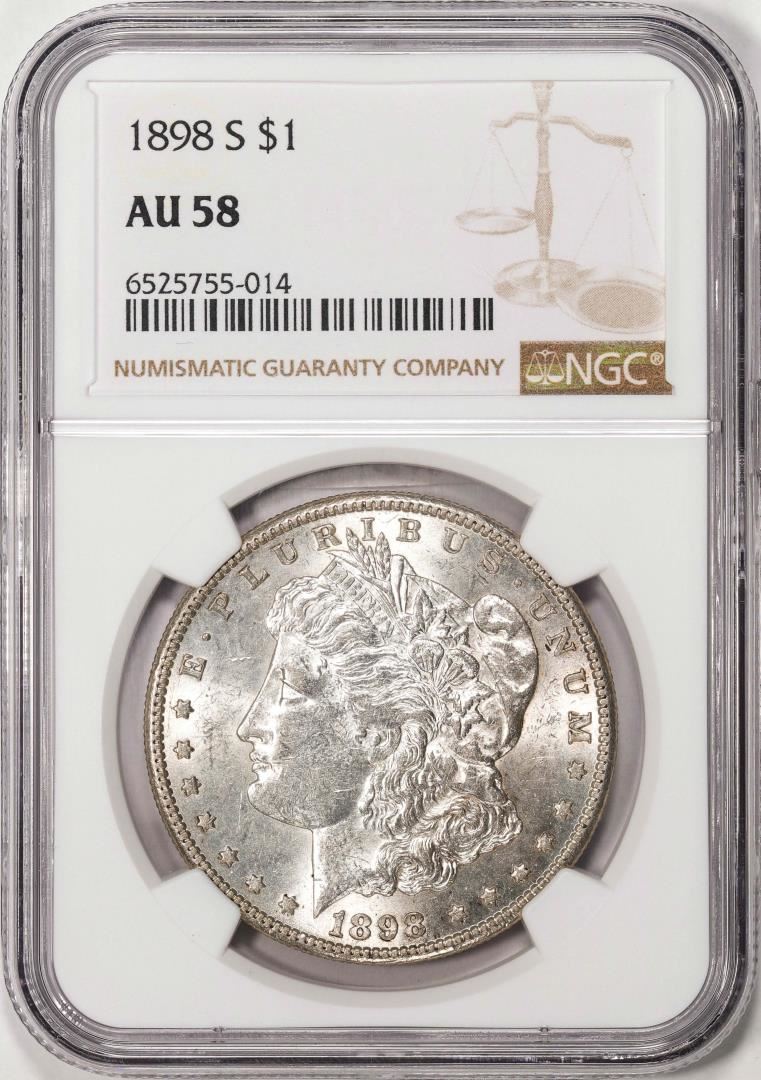 One 1898-S $1 Morgan Silver Dollar Coin NGC AU58. NGC Certified.