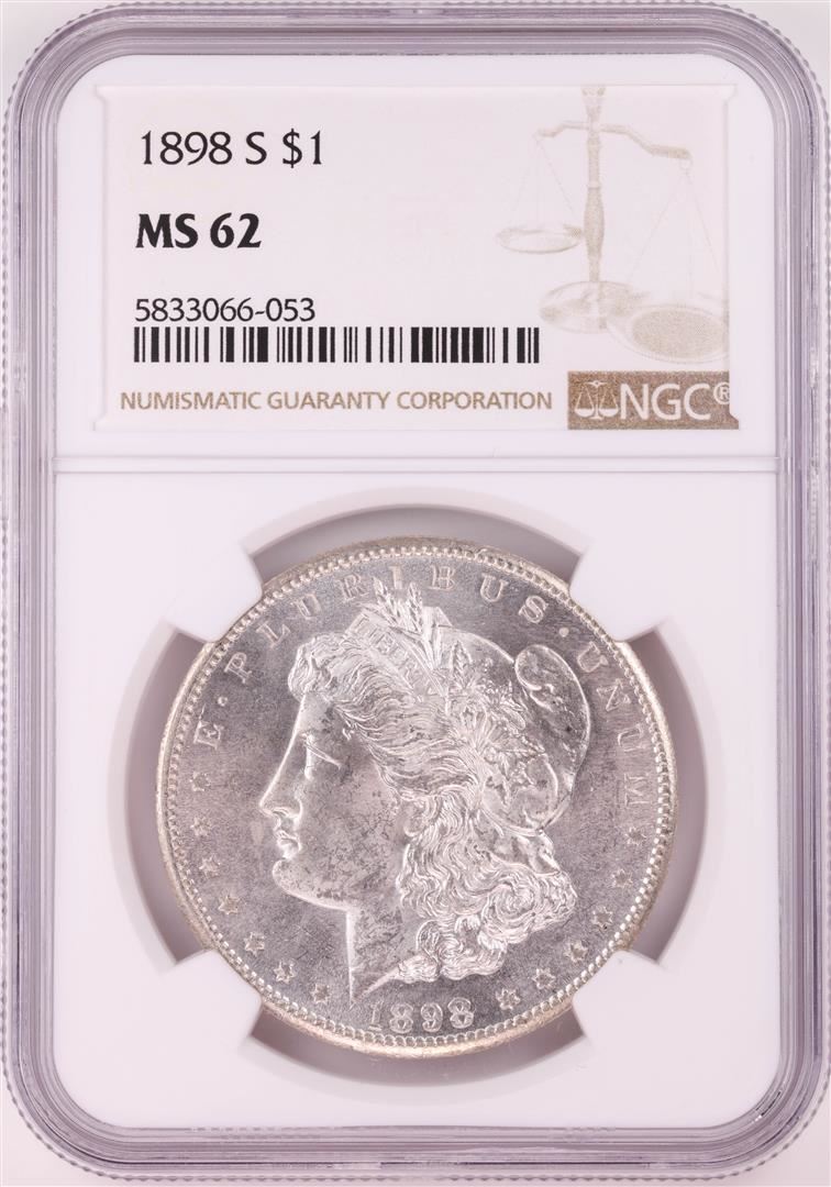 One 1898-S $1 Morgan Silver Dollar Coin NGC MS62. NGC Certified.