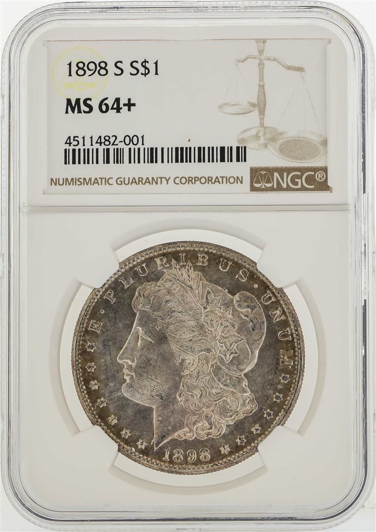 One 1898-S $1 Morgan Silver Dollar Coin NGC MS64+. NGC Certified.