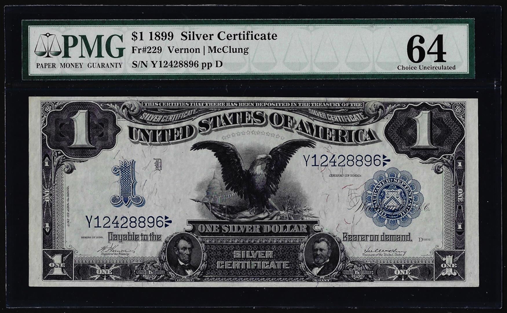 One 1899 $1 Black Eagle Silver Certificate Fr.229 PMG Choice Uncirculated 64. PMG Certified.