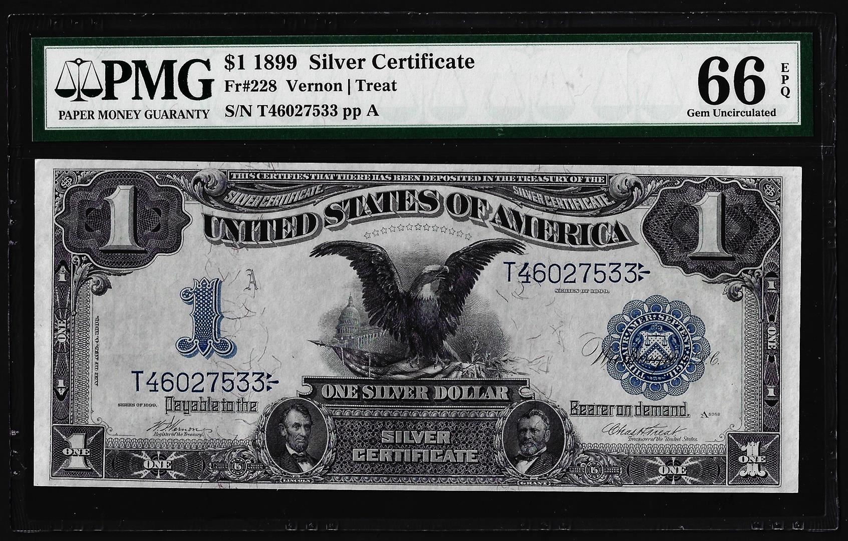 One 1899 $1 Black Eagle Silver Certificate Note Fr.228 PMG Gem Uncirculated 66EPQ. PMG Certified.