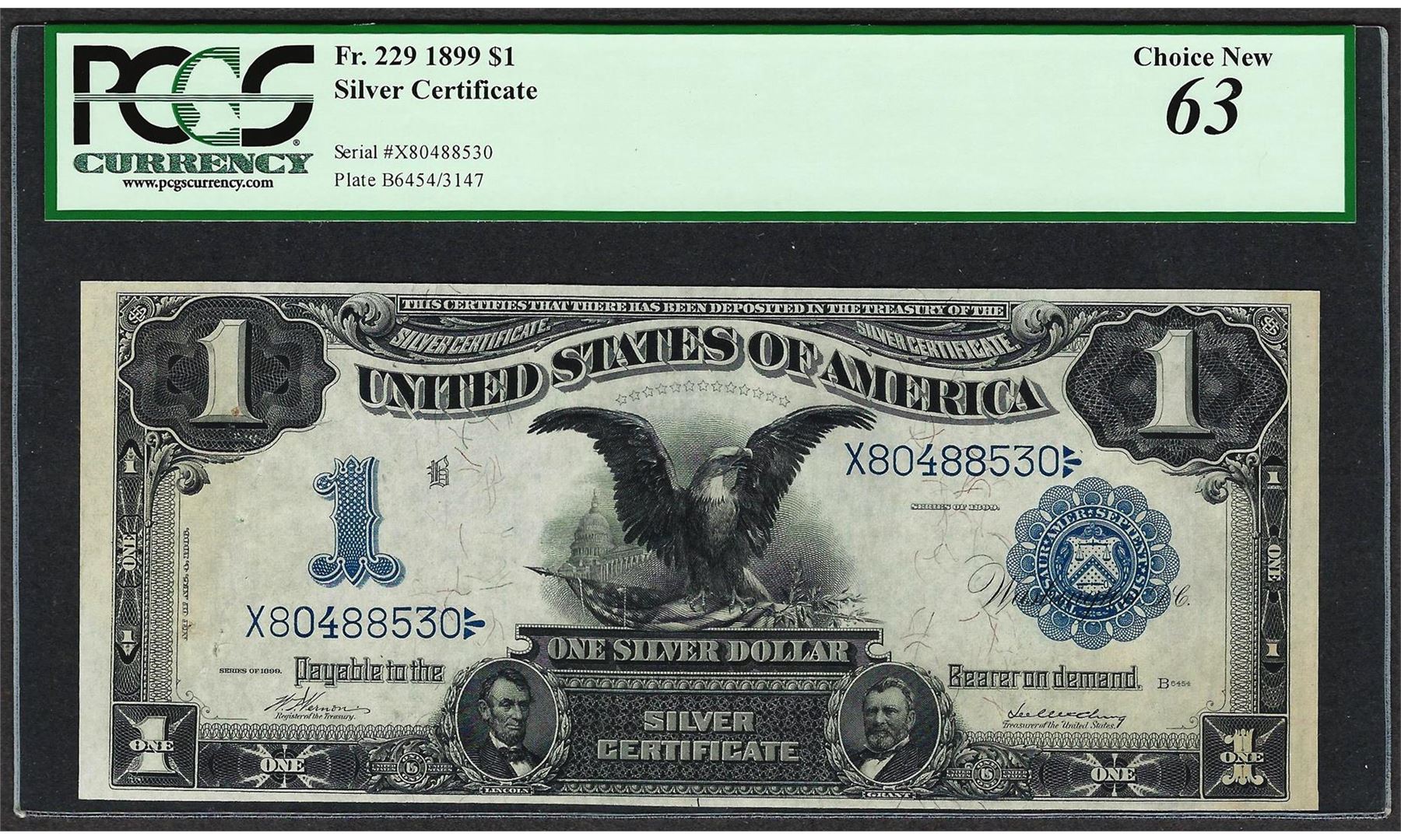 One 1899 $1 Black Eagle Silver Certificate Note Fr.229 PCGS Choice New 63. PCGS Graded.
