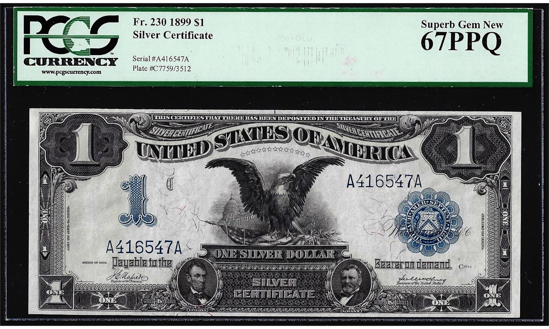 One 1899 $1 Black Eagle Silver Certificate Note Fr.230 PCGS Superb Gem New 67PPQ. PCGS Graded.