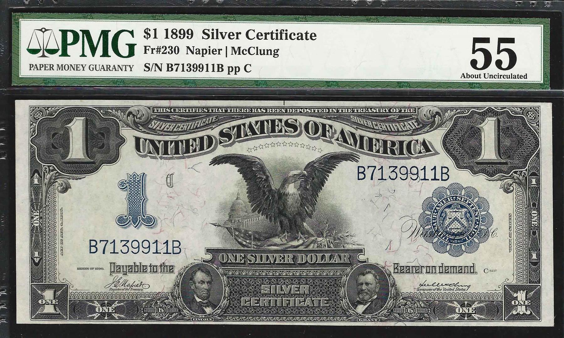 One 1899 $1 Black Eagle Silver Certificate Note Fr.230 PMG About Uncirculated 55. PMG Certified.