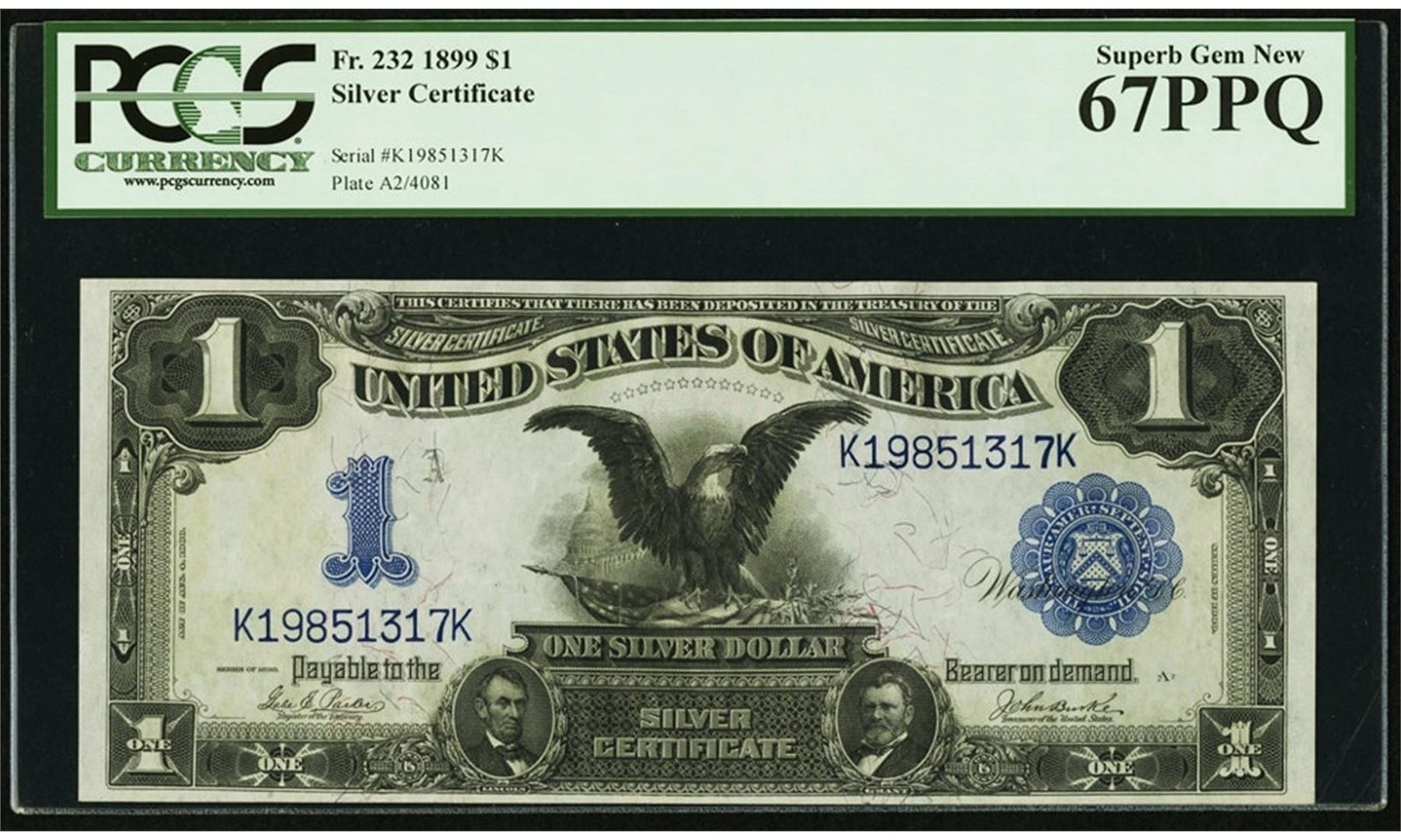 One 1899 $1 Black Eagle Silver Certificate Note Fr.232 PCGS Superb Gem New 67PPQ. PCGS Graded.