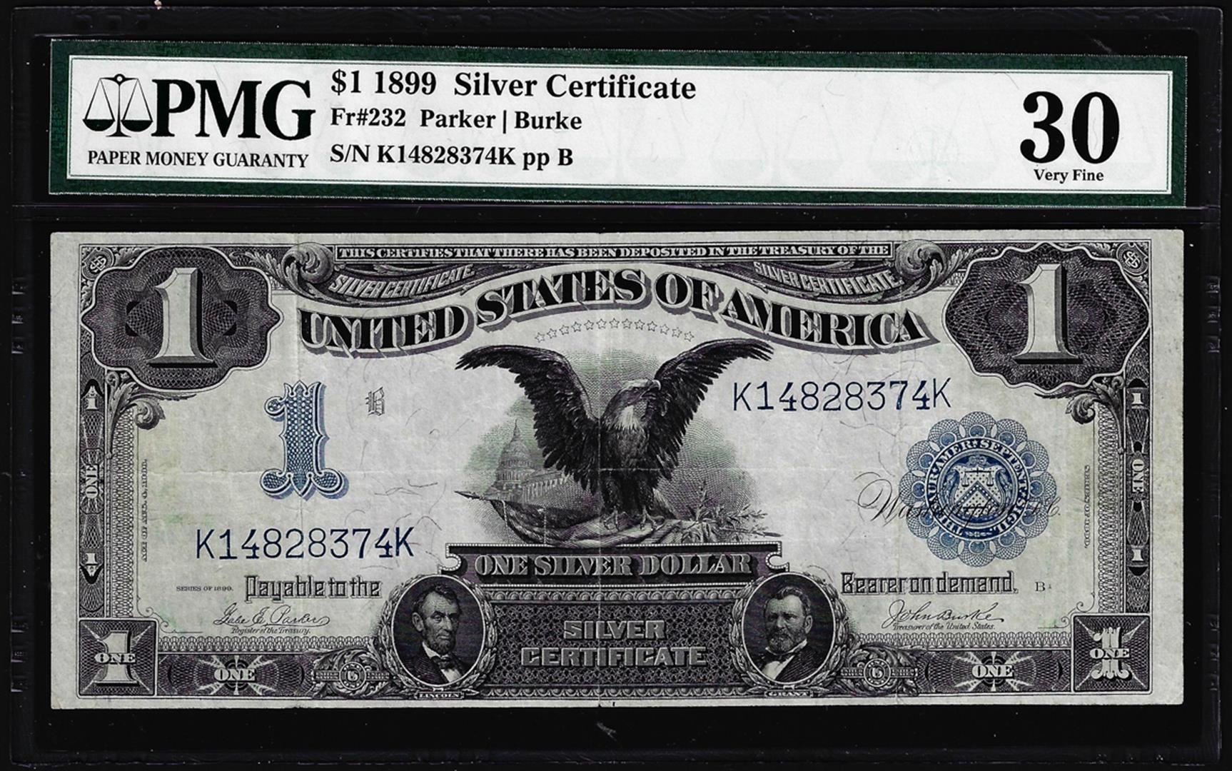 One 1899 $1 Black Eagle Silver Certificate Note Fr.232 PMG Very Fine 30. PMG Certified.