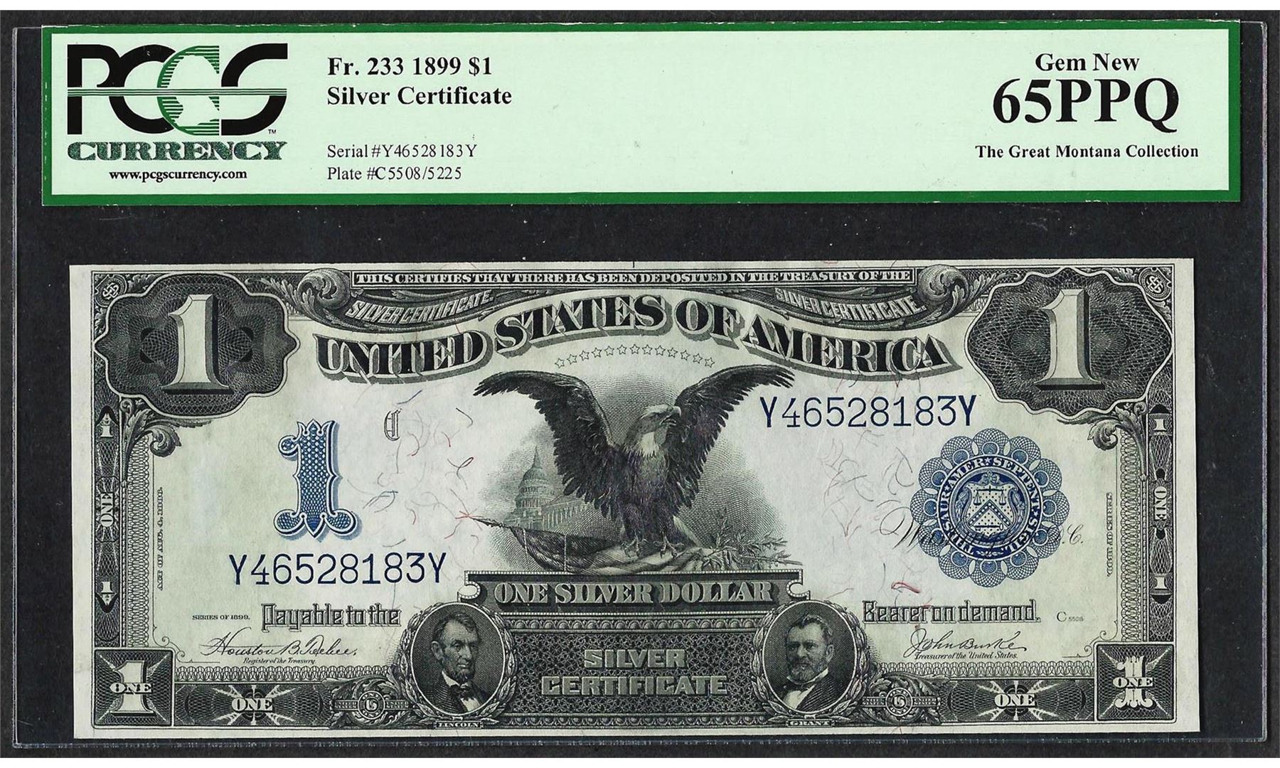 One 1899 $1 Black Eagle Silver Certificate Note Fr.233 PCGS Gem New 65PPQ. PCGS Graded.