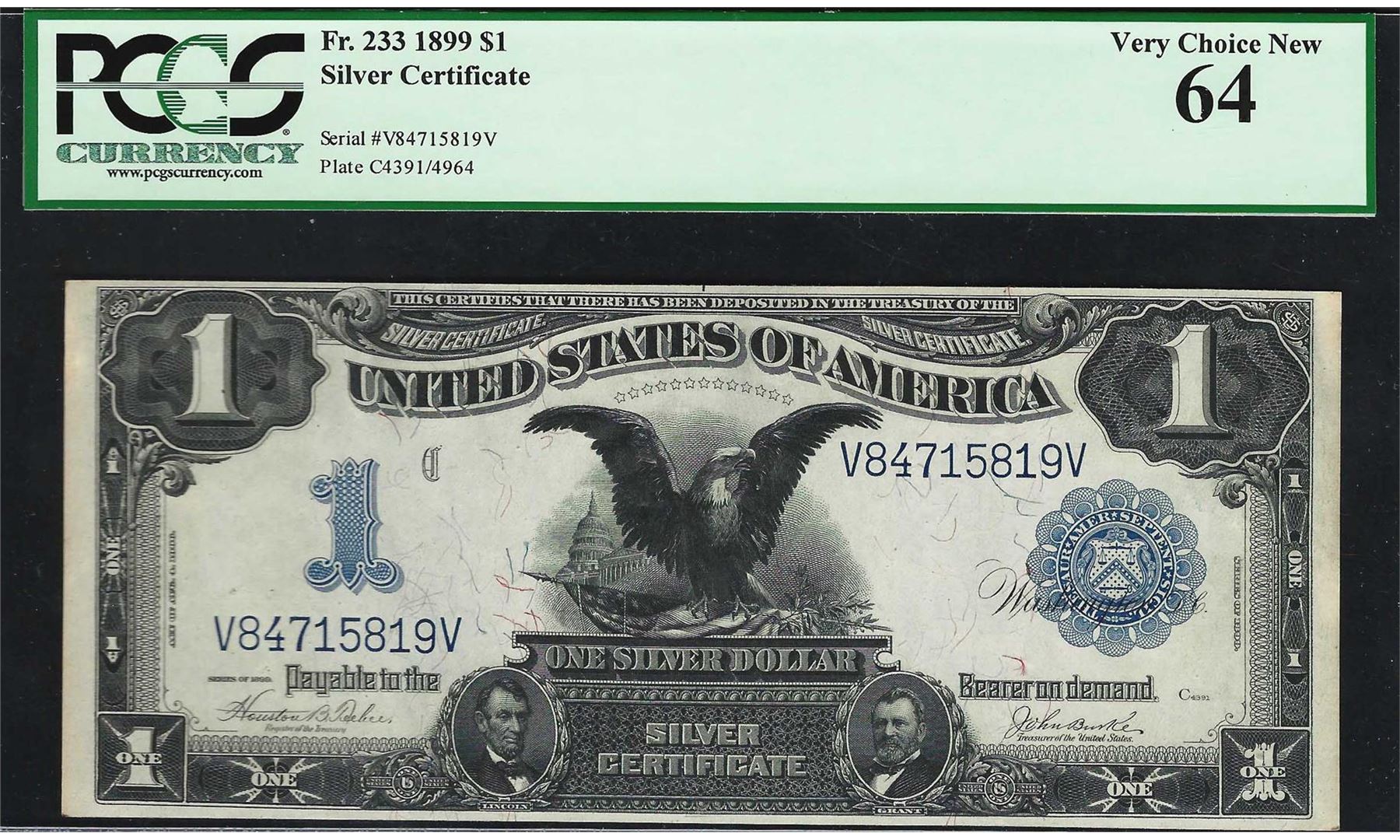 One 1899 $1 Black Eagle Silver Certificate Note Fr.233 PCGS Very Choice New 64. PCGS Graded.