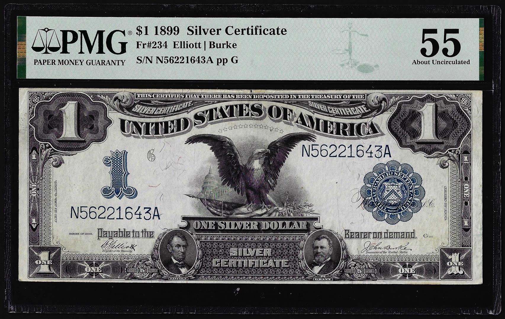 One 1899 $1 Black Eagle Silver Certificate Note Fr.234 PMG About Uncirculated 55. PMG Certified.