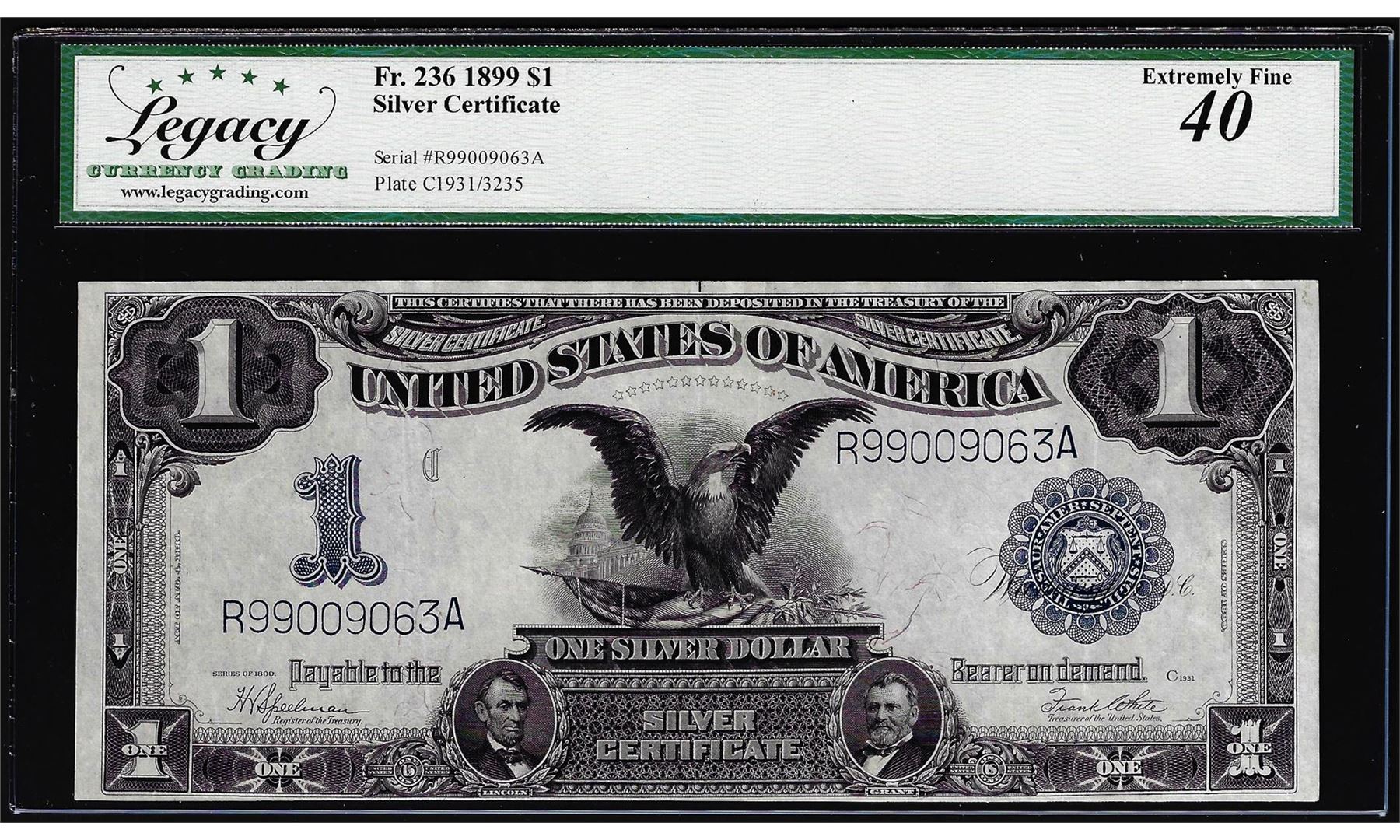 One 1899 $1 Black Eagle Silver Certificate Note Fr.236 Legacy Extremely Fine 40. Legacy Graded.