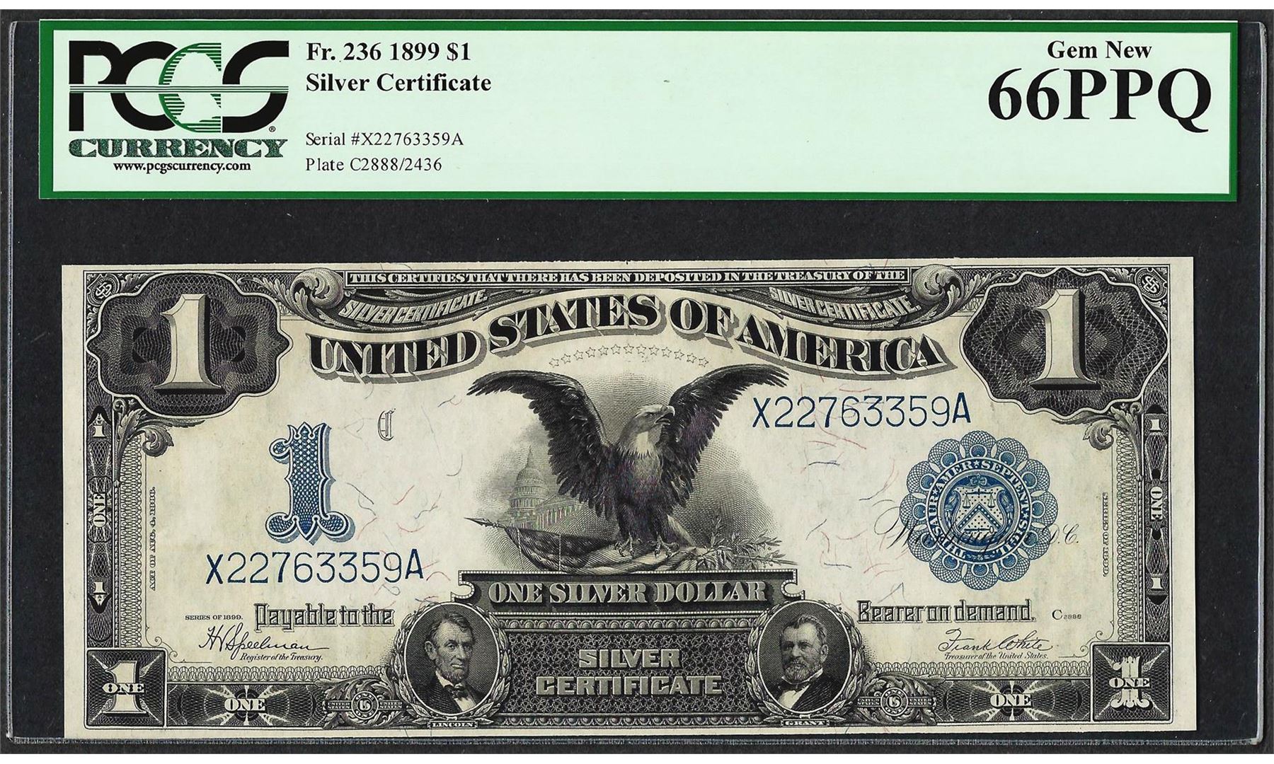 One 1899 $1 Black Eagle Silver Certificate Note Fr.236 PCGS Gem New 66PPQ. PCGS Graded.