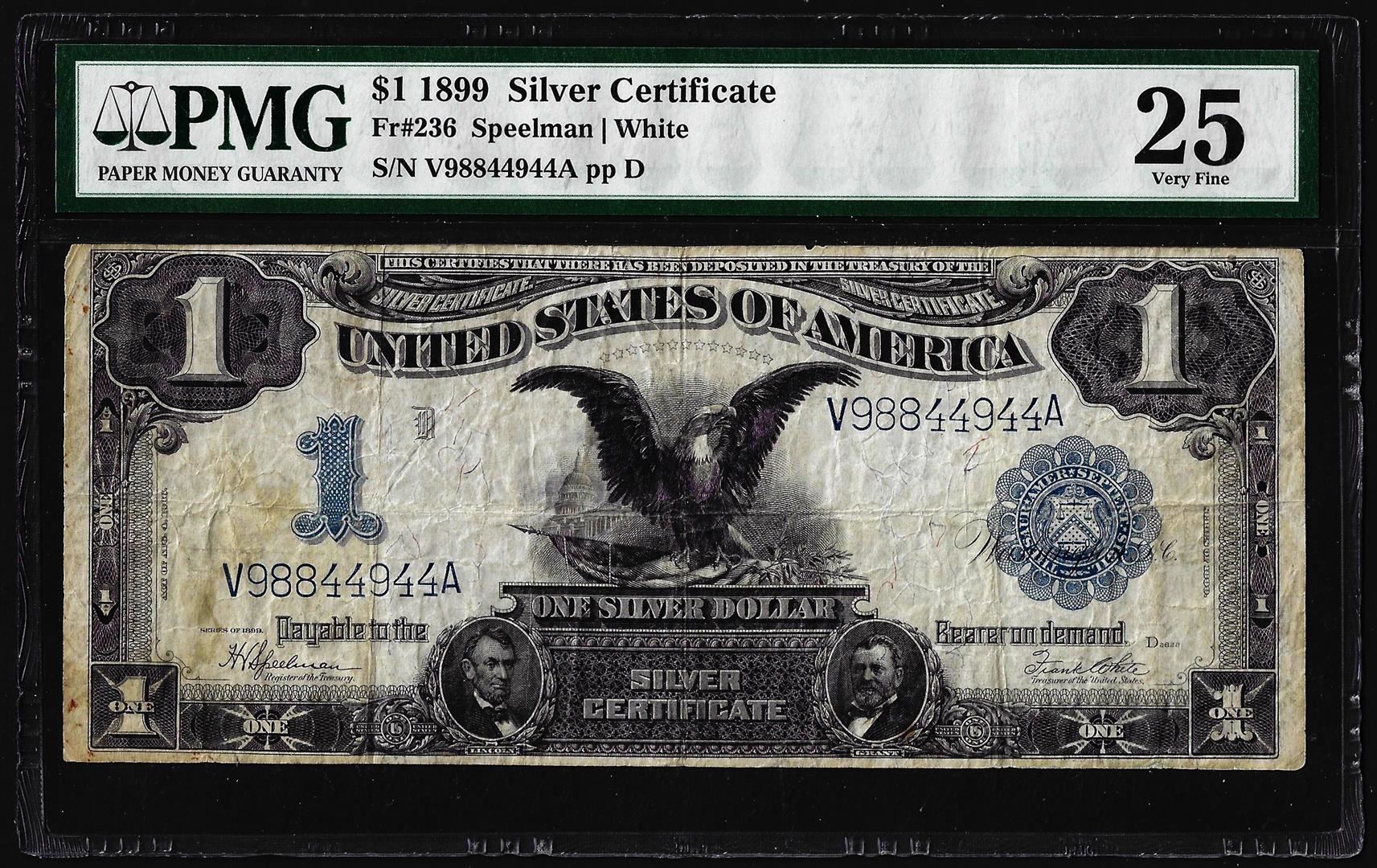 One 1899 $1 Black Eagle Silver Certificate Note Fr.236 PMG Very Fine 25. PMG Certified.