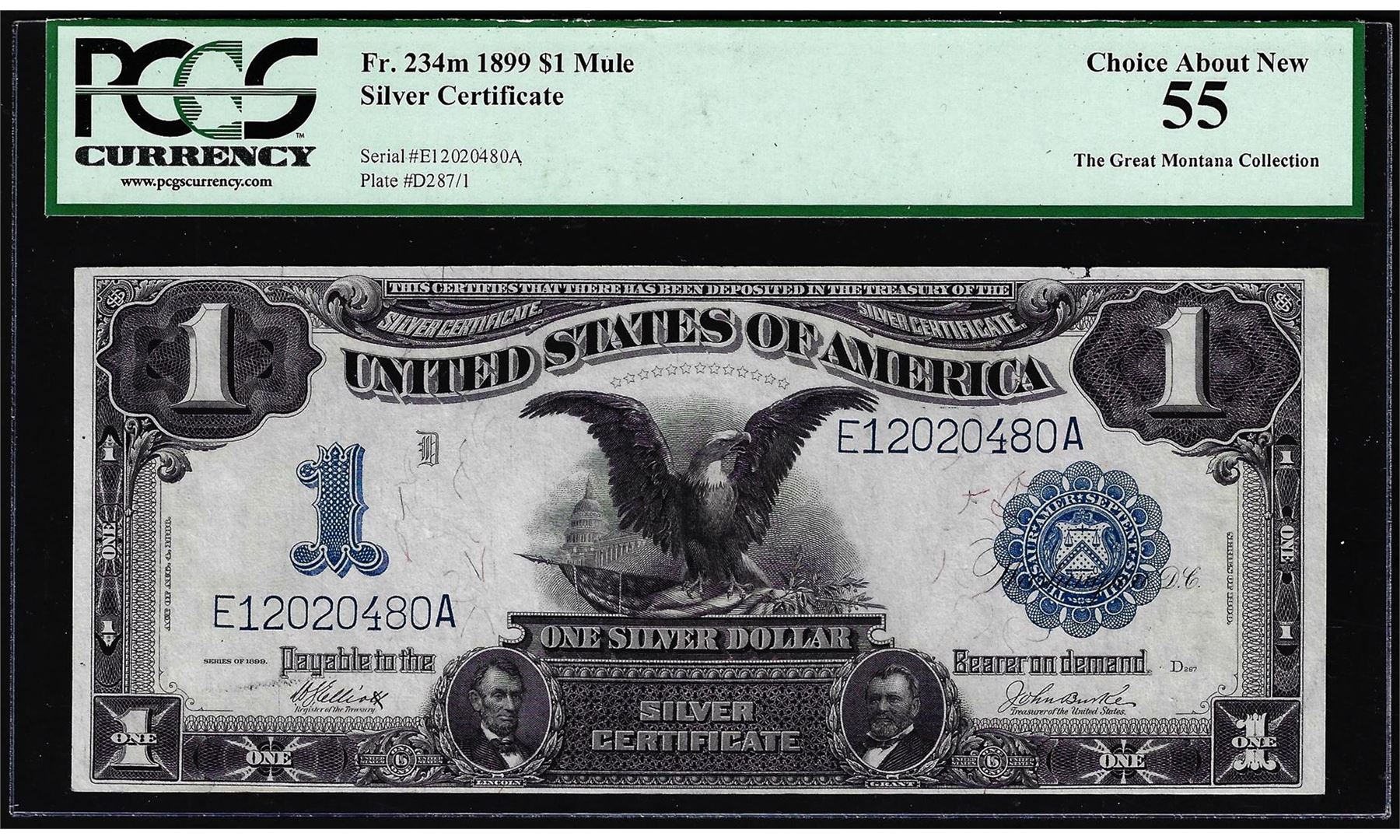 One 1899 $1 Black Eagle Silver Certificate Note Mule Fr.234m PCGS Choice About New 55. PCGS Graded.