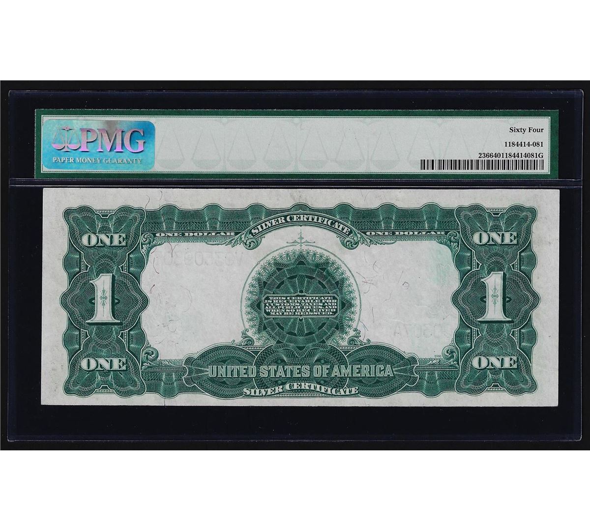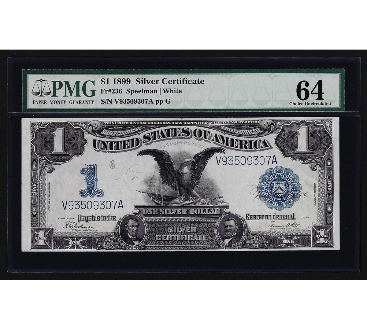 One 1899 $1 Black Eagle Silver Certificate Note PMG CU64. PMG Certified.